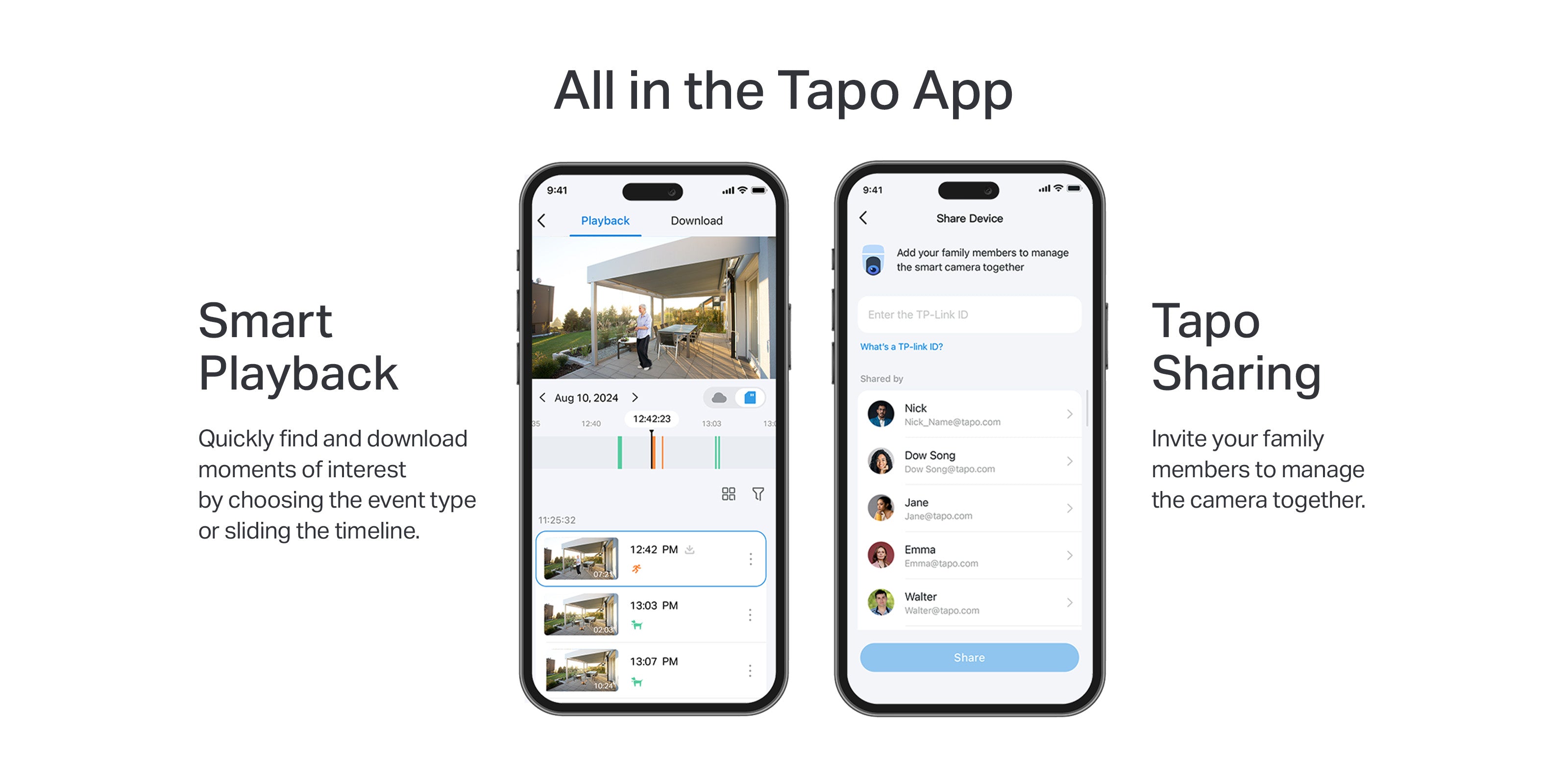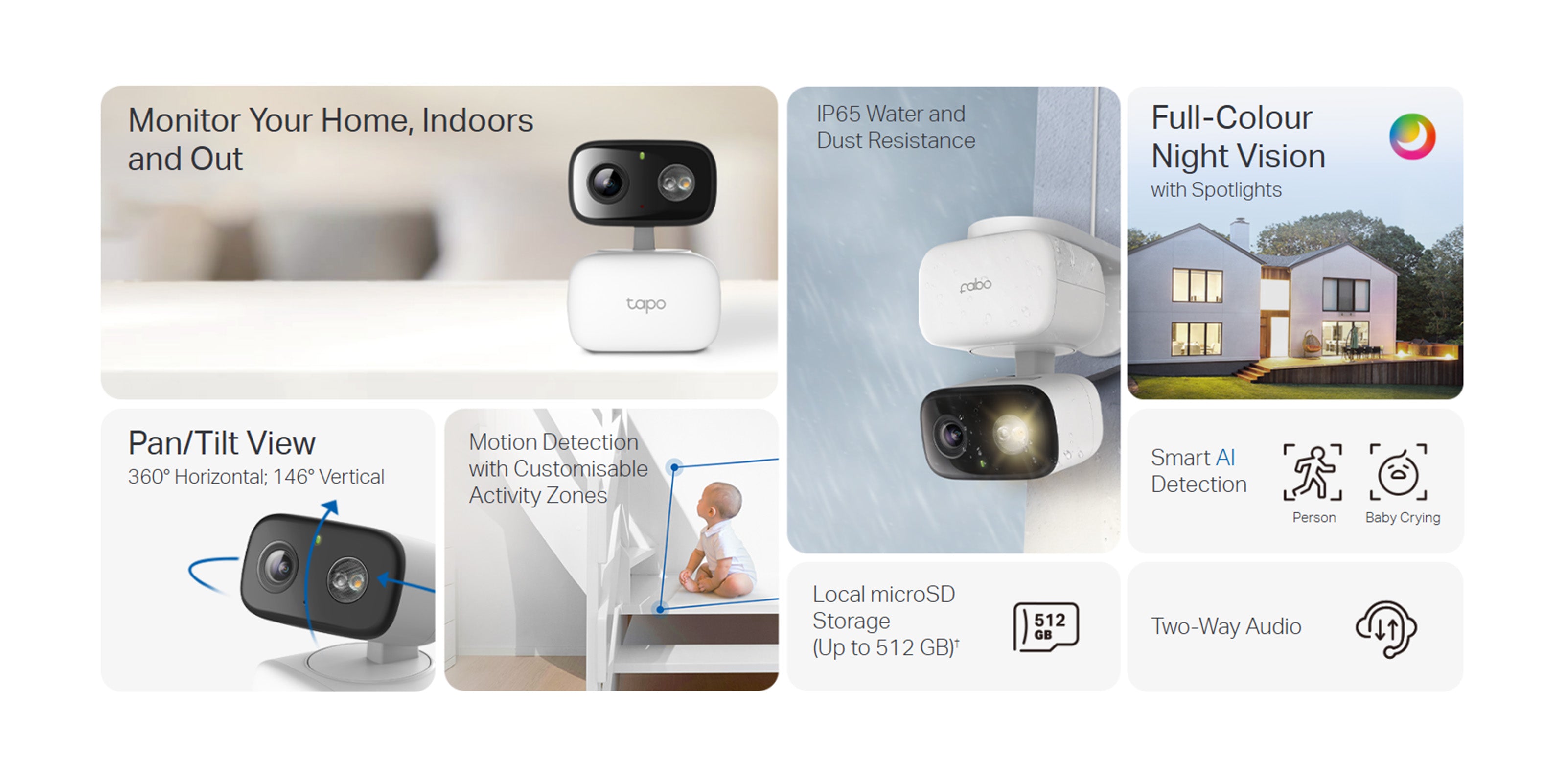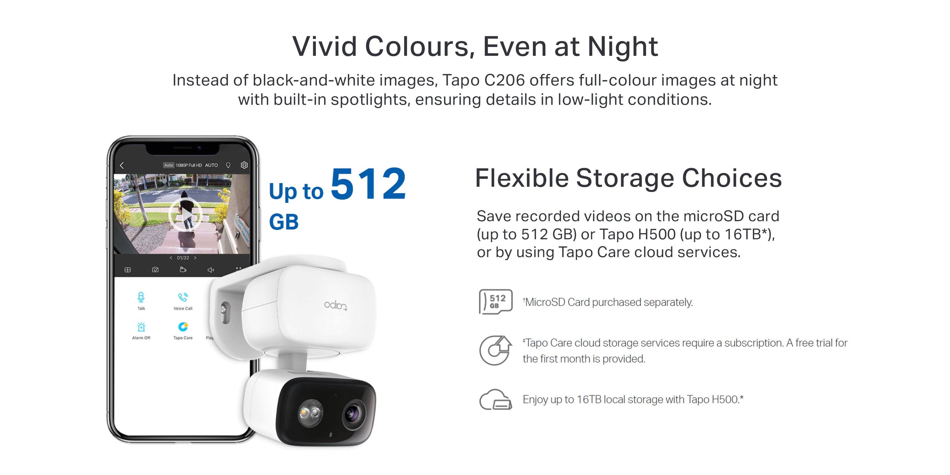 - Local and Cloud Storage: Save recorded videos to a microSD card (up to 512 GB) or by using Tapo Care cloud storage services.