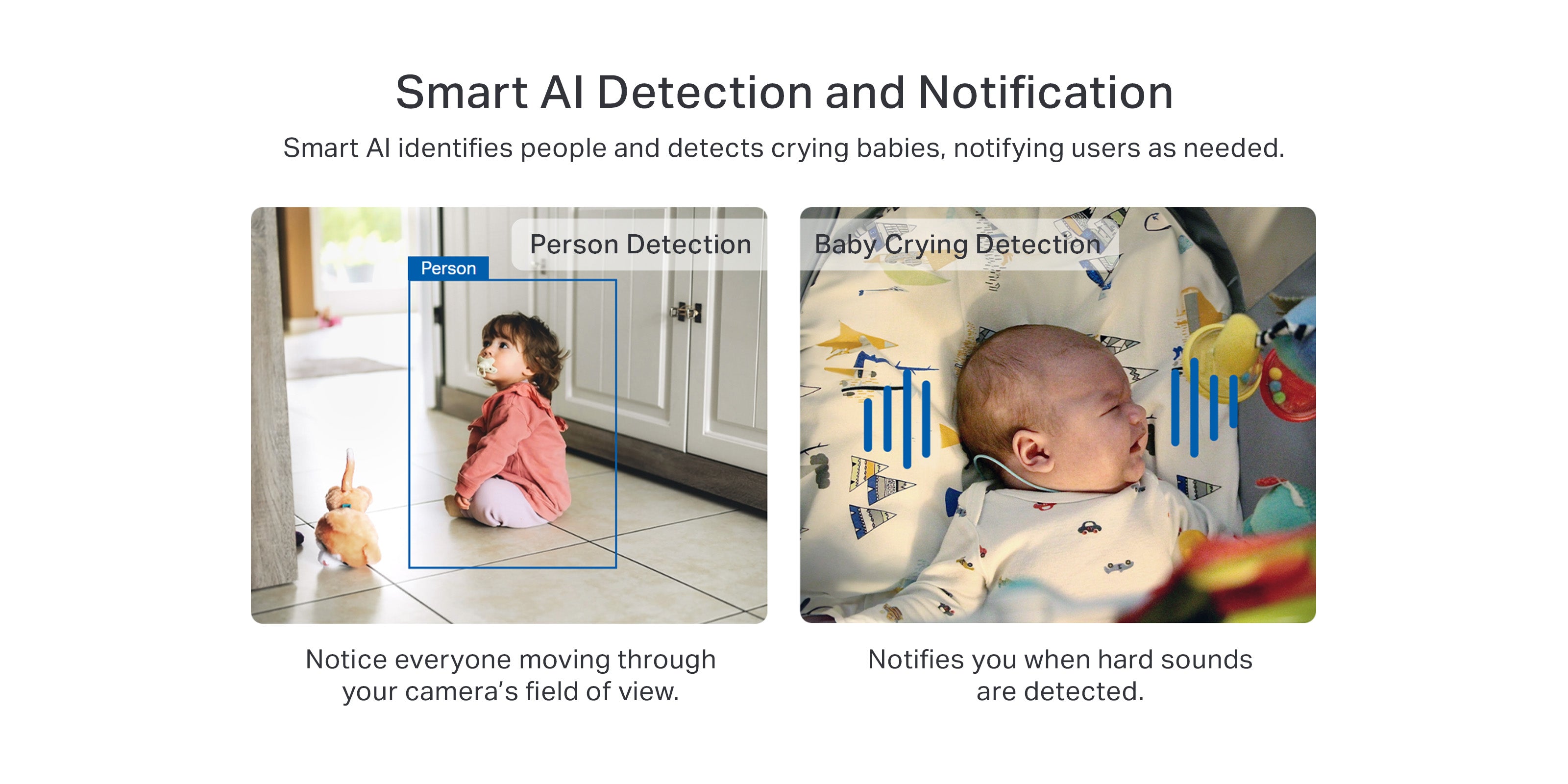 - Smart AI Detection and Notifications: Identifies people and detects crying babies, notifying users as needed.
