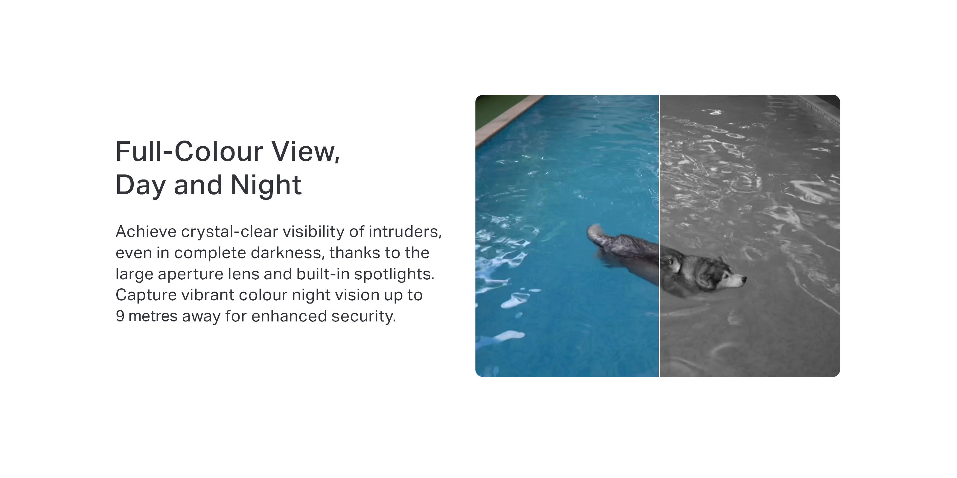 - Colour Night Vision: See the night in vivid colours with the large aperture lens and built-in spotlights effective up to 30 feet (9m).