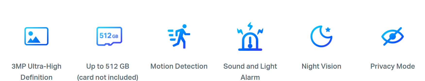 3MP wireless indoor security camera with motion detection notifications, advanced night vision up to 30ft, two-way audio, sound and light alarm for essential home monitoring.