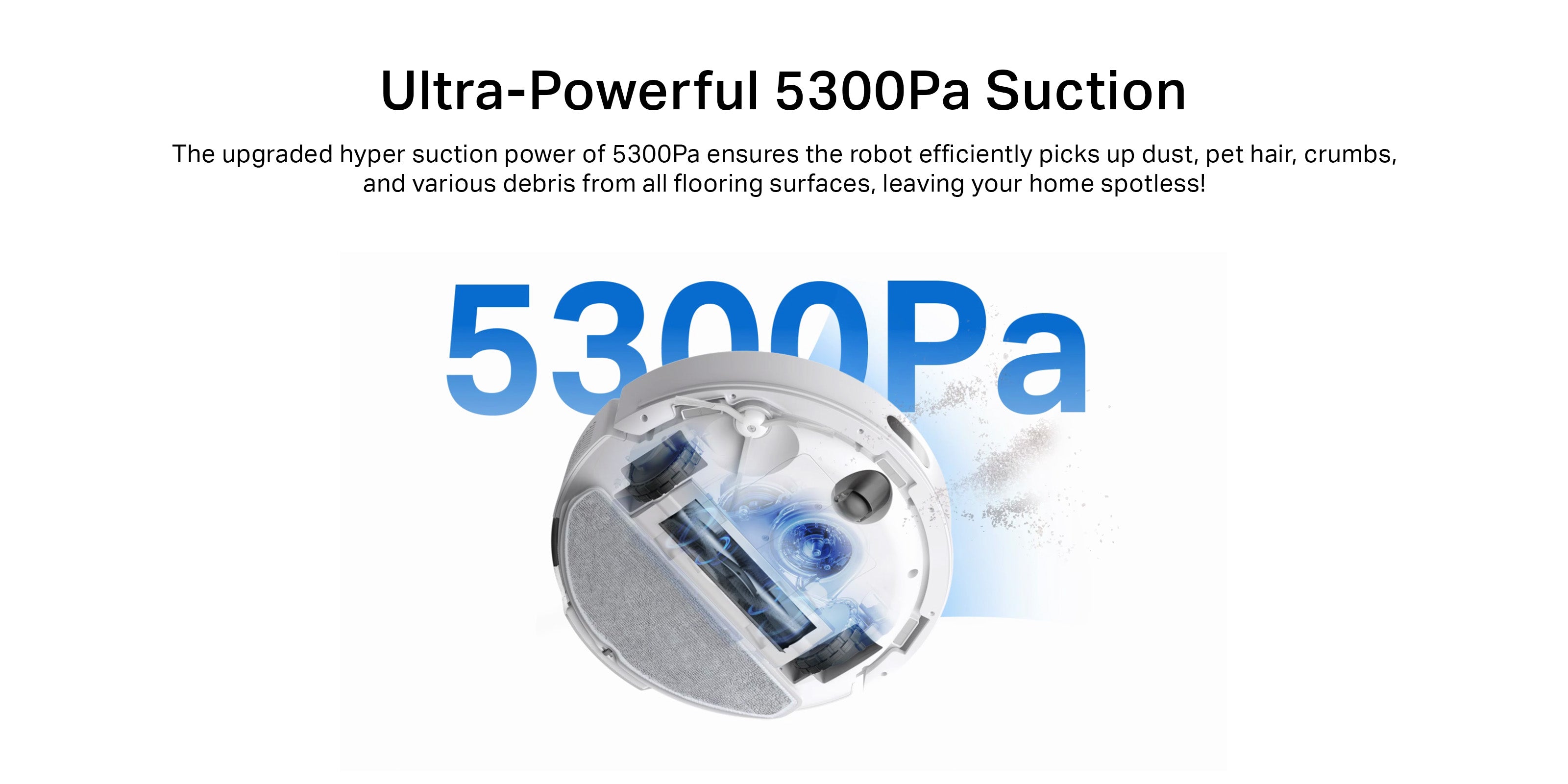 - Ultra-Powerful 5300Pa Suction - Ensures the robot efficiently picks up dust, pet hair, crumbs, and various debris from all flooring surfaces, leaving your home spotless.