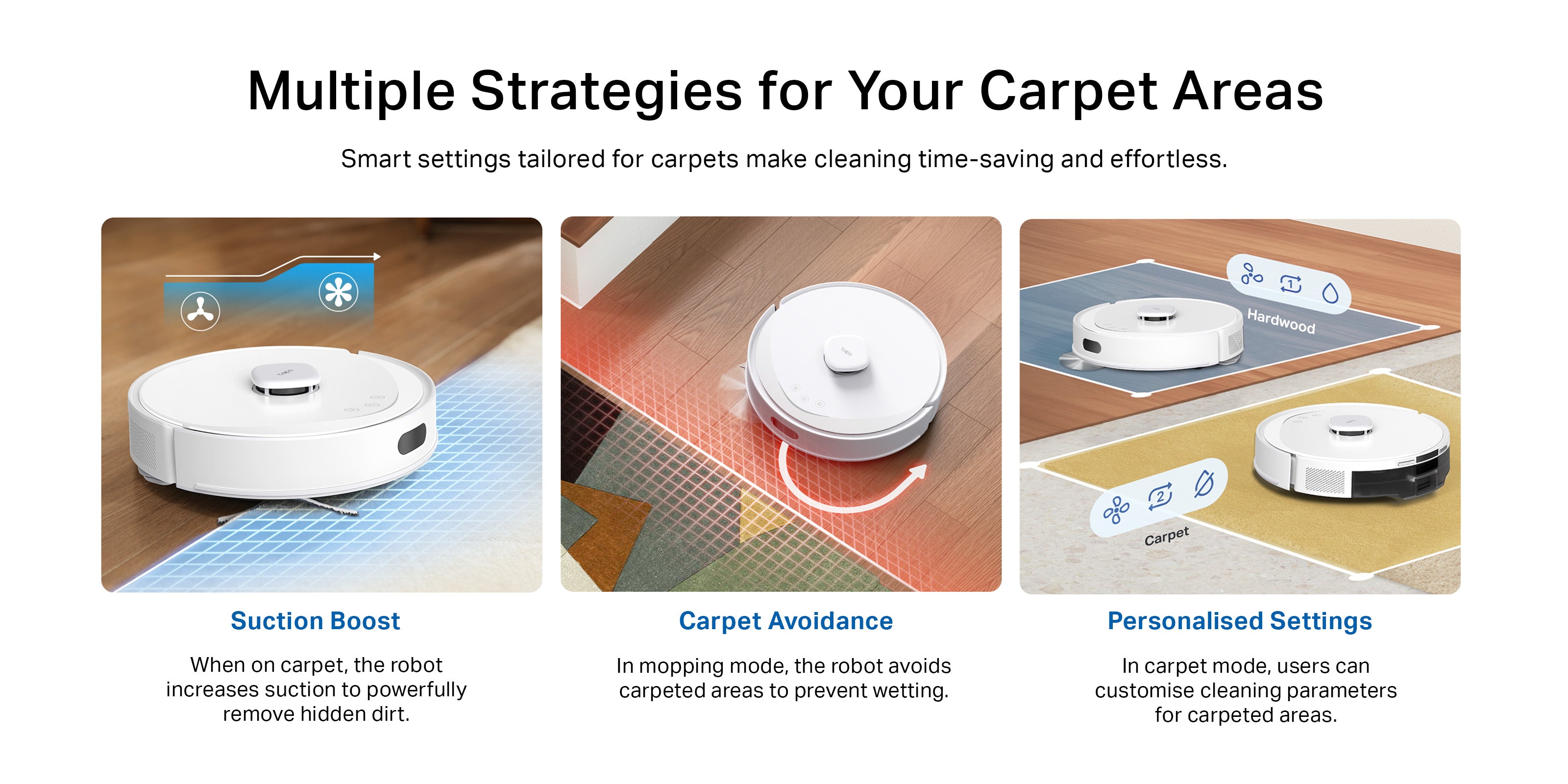 - Carpet Avoidance - Avoid getting carpet areas wet in mopping mode.