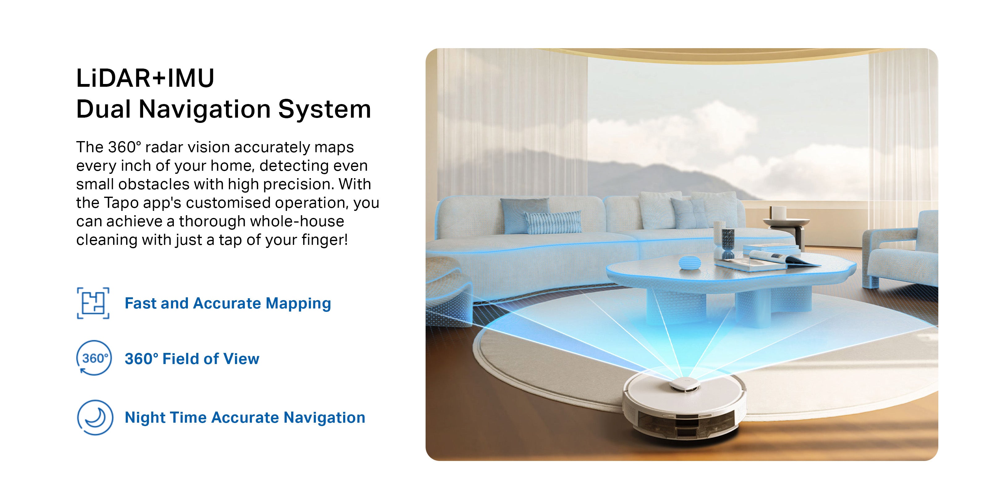 - LiDAR+IMU Dual Navigation System - Accurately maps out your house in minutes, avoids omissions and repeated cleaning, and even works well in the dark.
