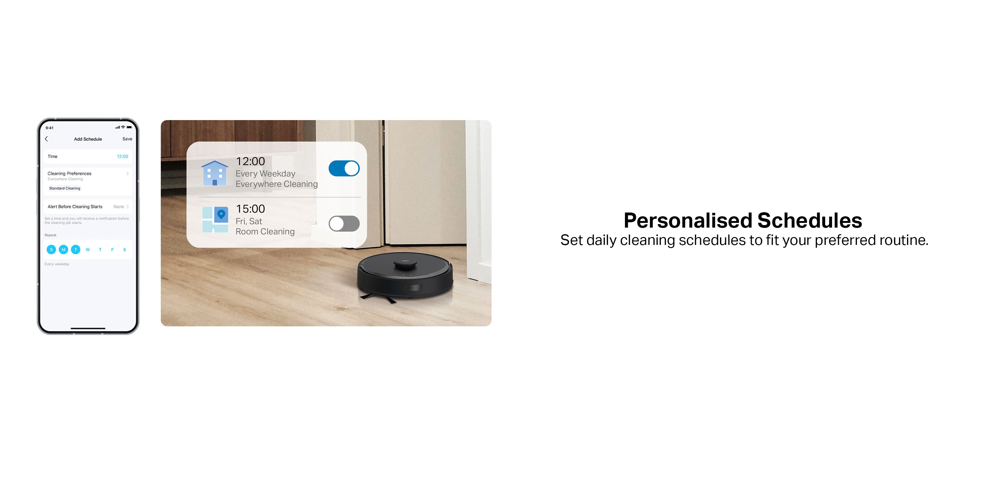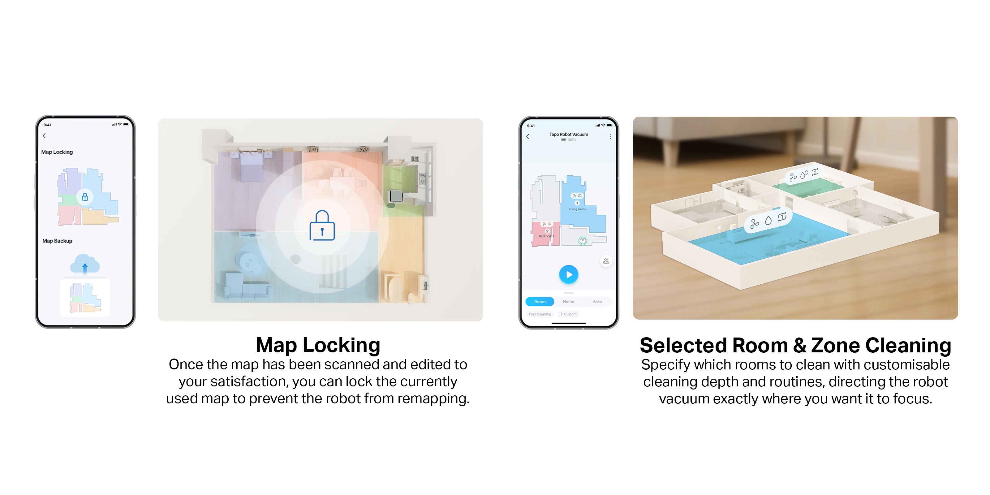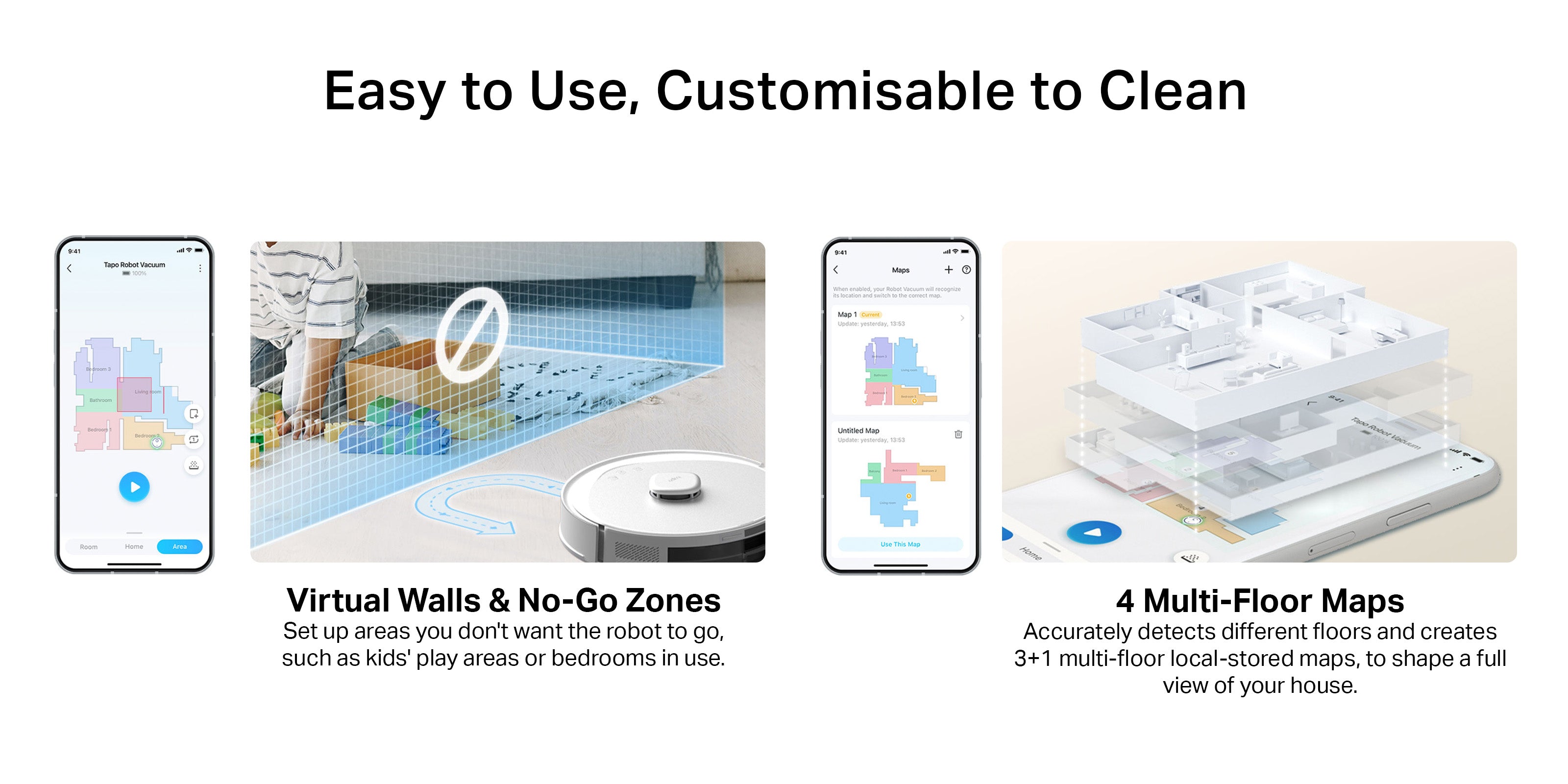 - Customisable Cleaning - Merge and separate areas, set a cleaning schedule, and customise clean modes for each room.