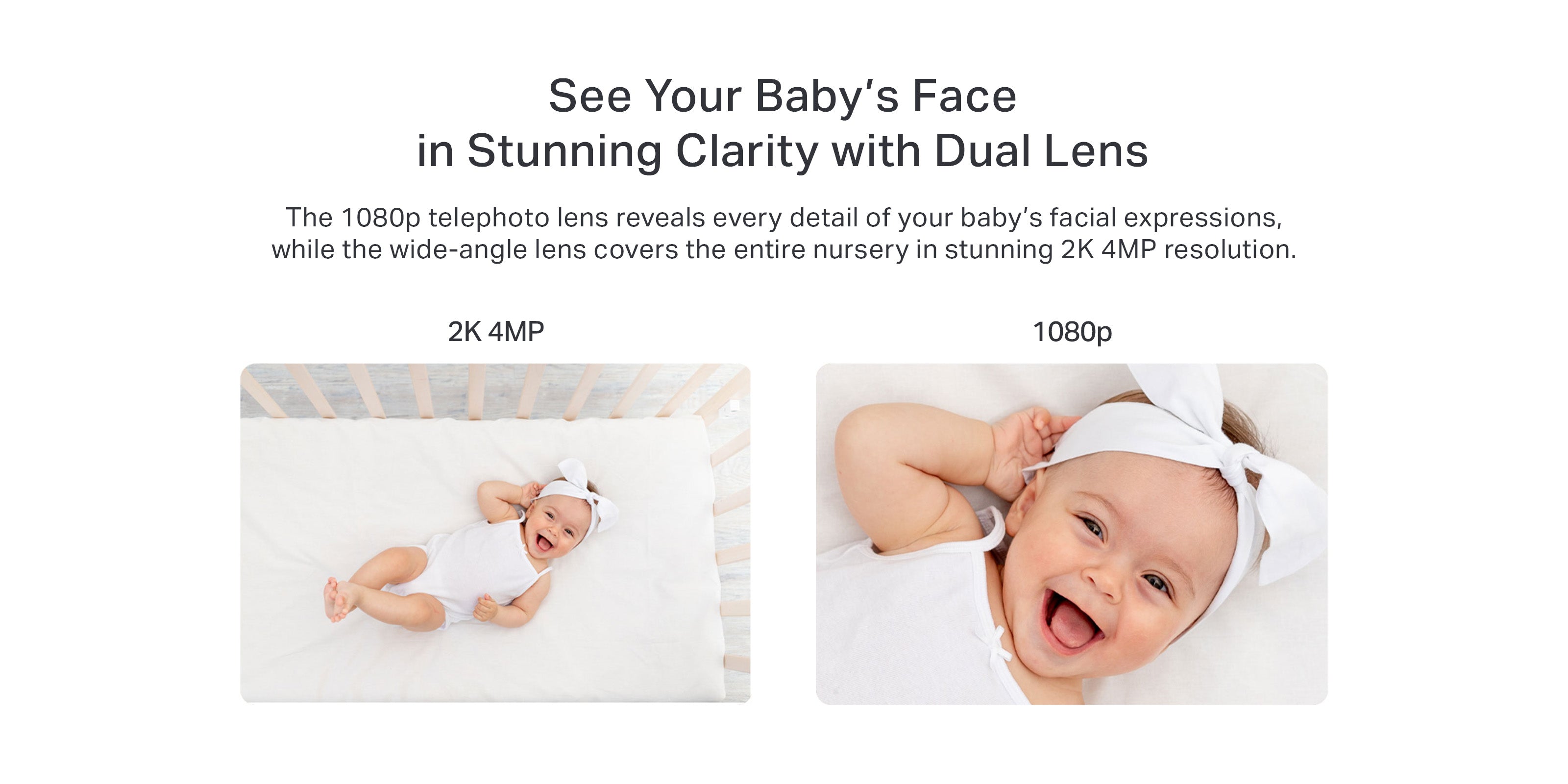 See your Baby's Face in Stunning Clarity with Dual-Lens: The 1080p telephoto lens reveals every detail of your baby's facial expressions, while the wide-angle lens covers the entire nursery in 2K 4MP resolution.
