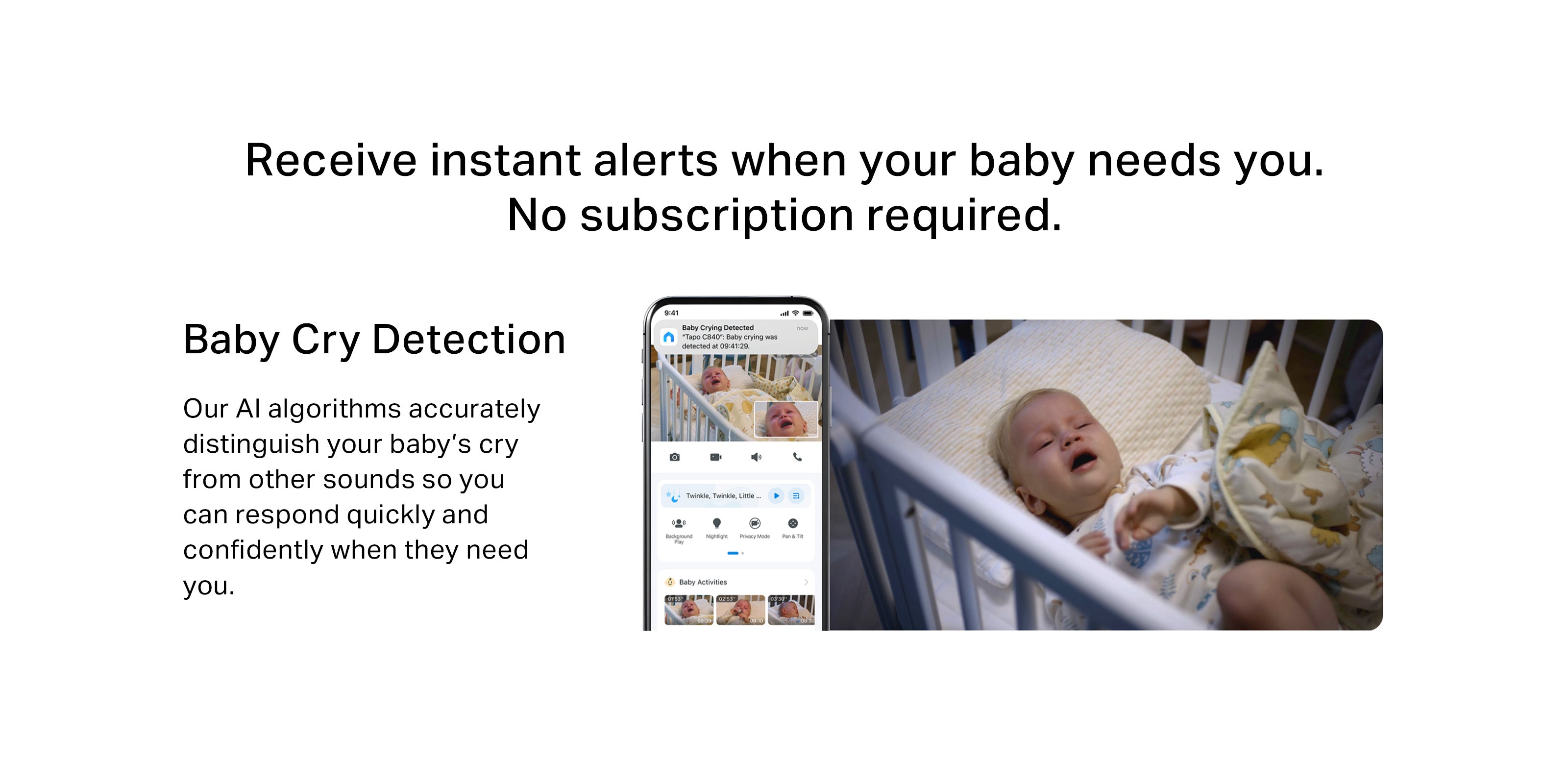 Baby Cry Detection: Our AI algorithms accurately distinguish your baby's cry from other sounds so you can respond quickly when your they need you.