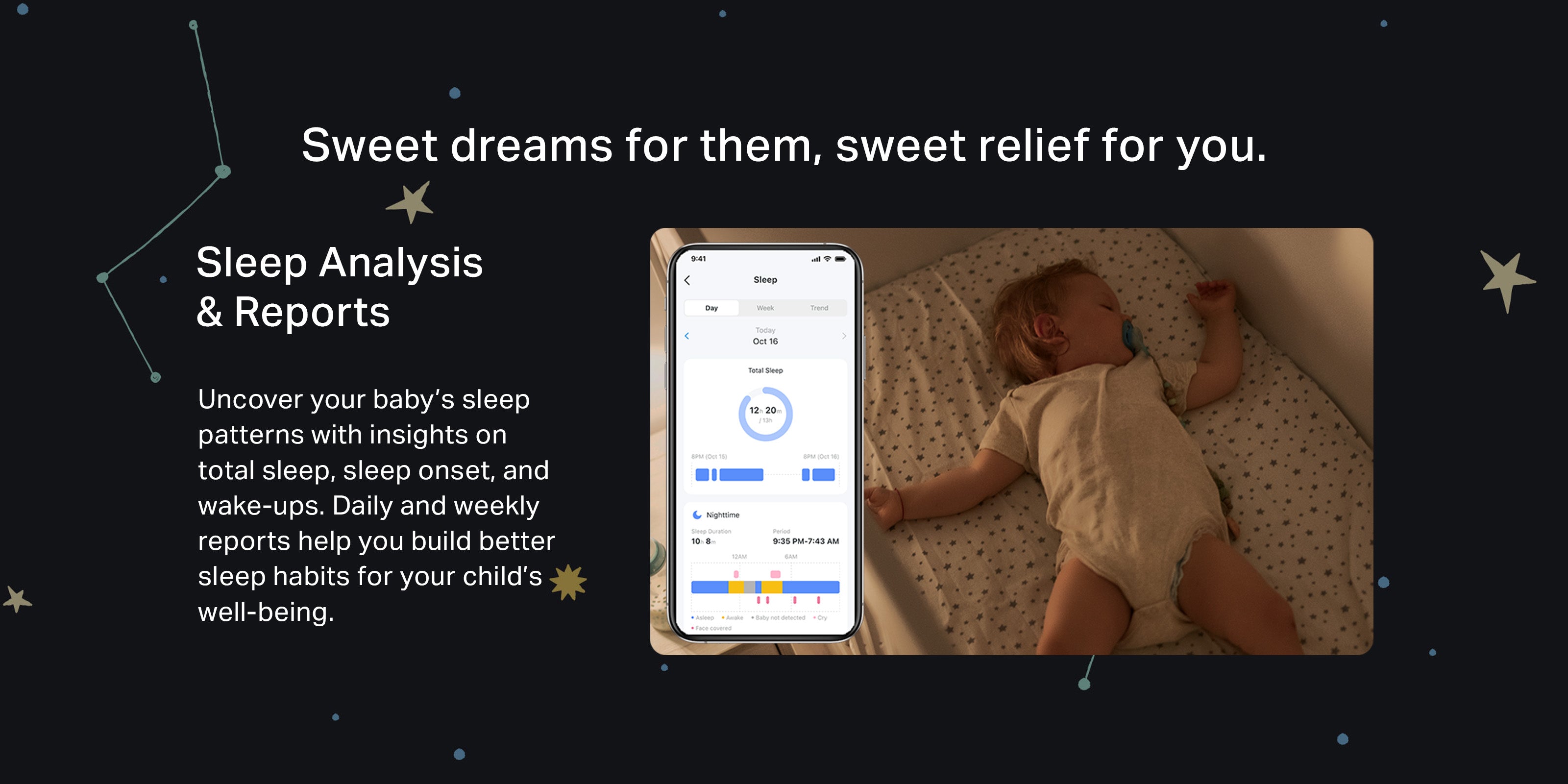 - Sleep Analysis & Report: Uncover your baby’s sleep patterns with insights on total sleep, sleep onset, and wake-ups.