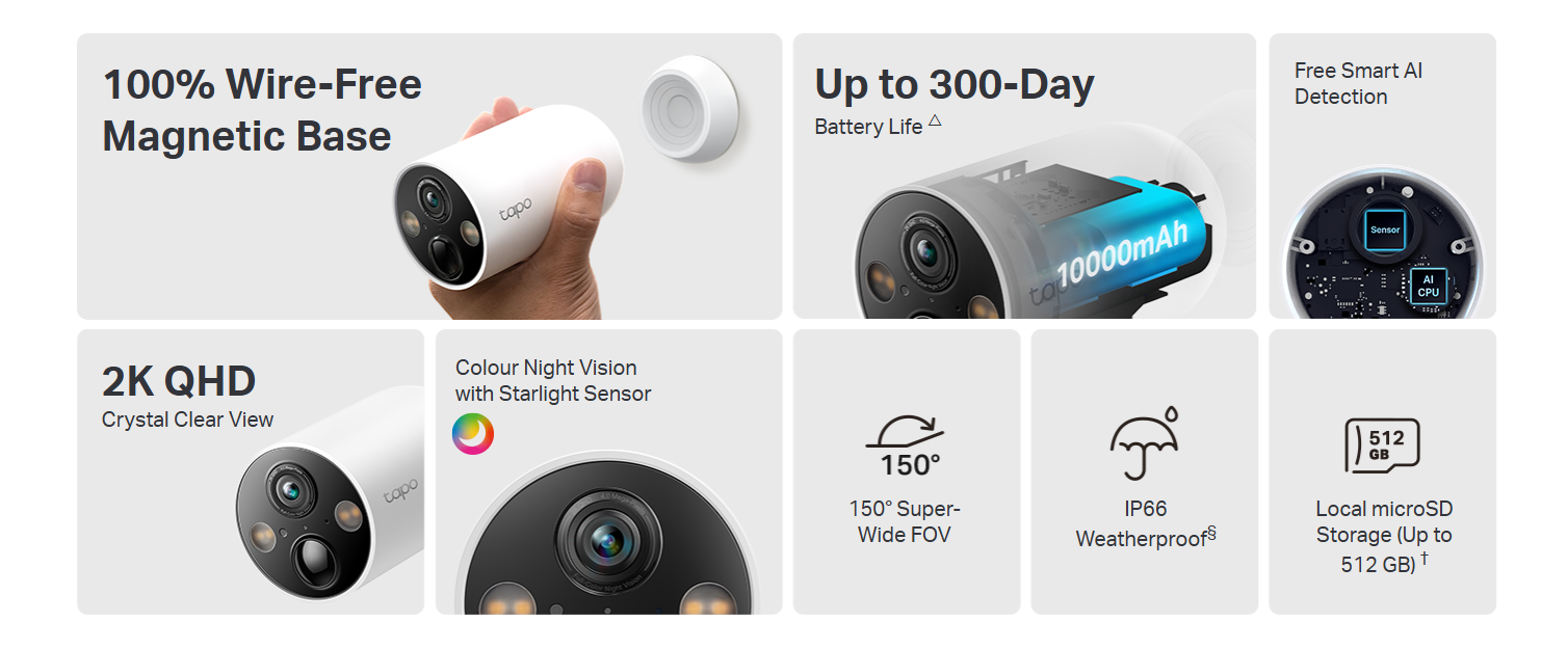 *Tapo solar panel purchased separately. Actual experience may vary due to placement angle, weather conditions, and camera usage.