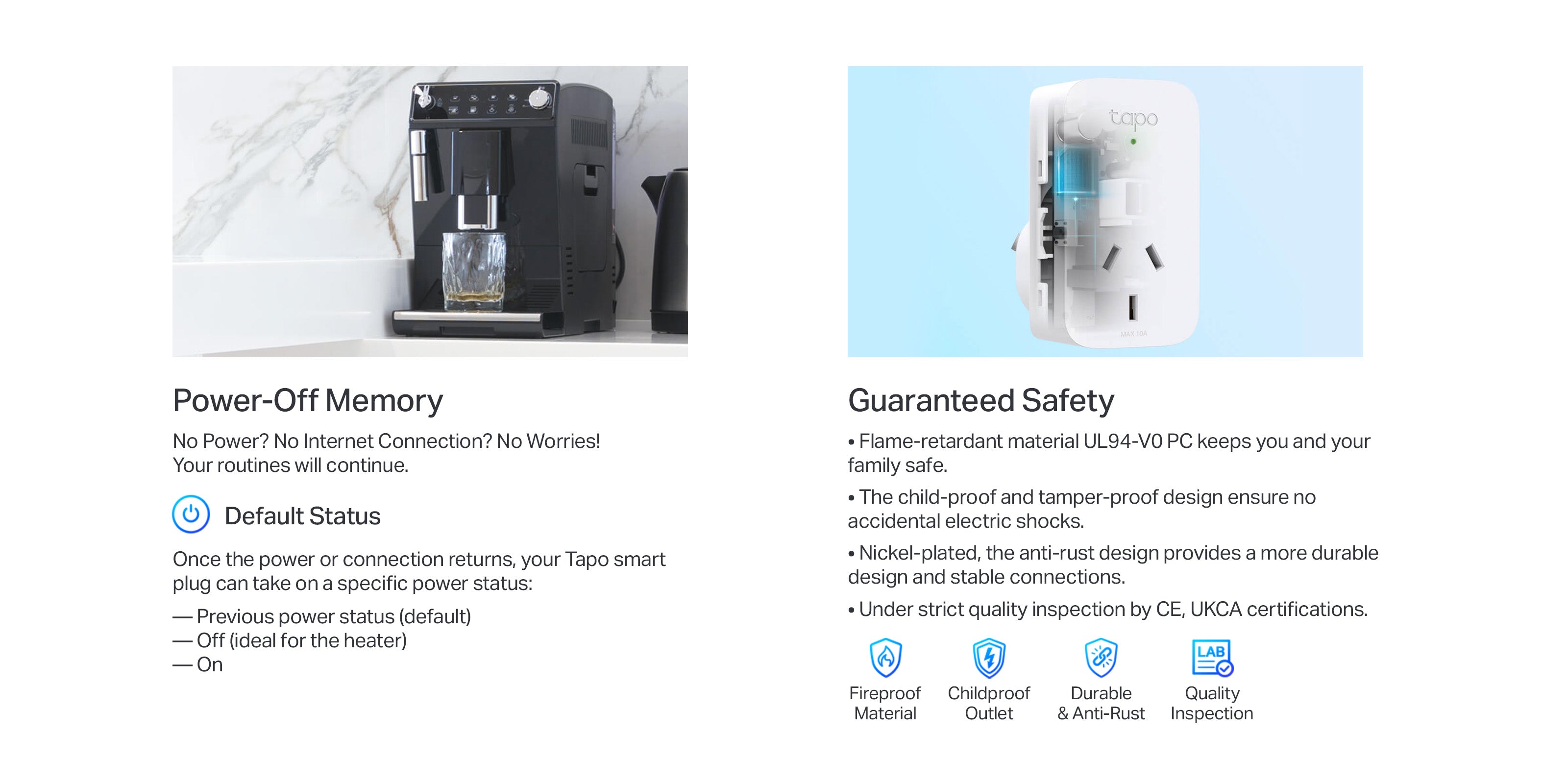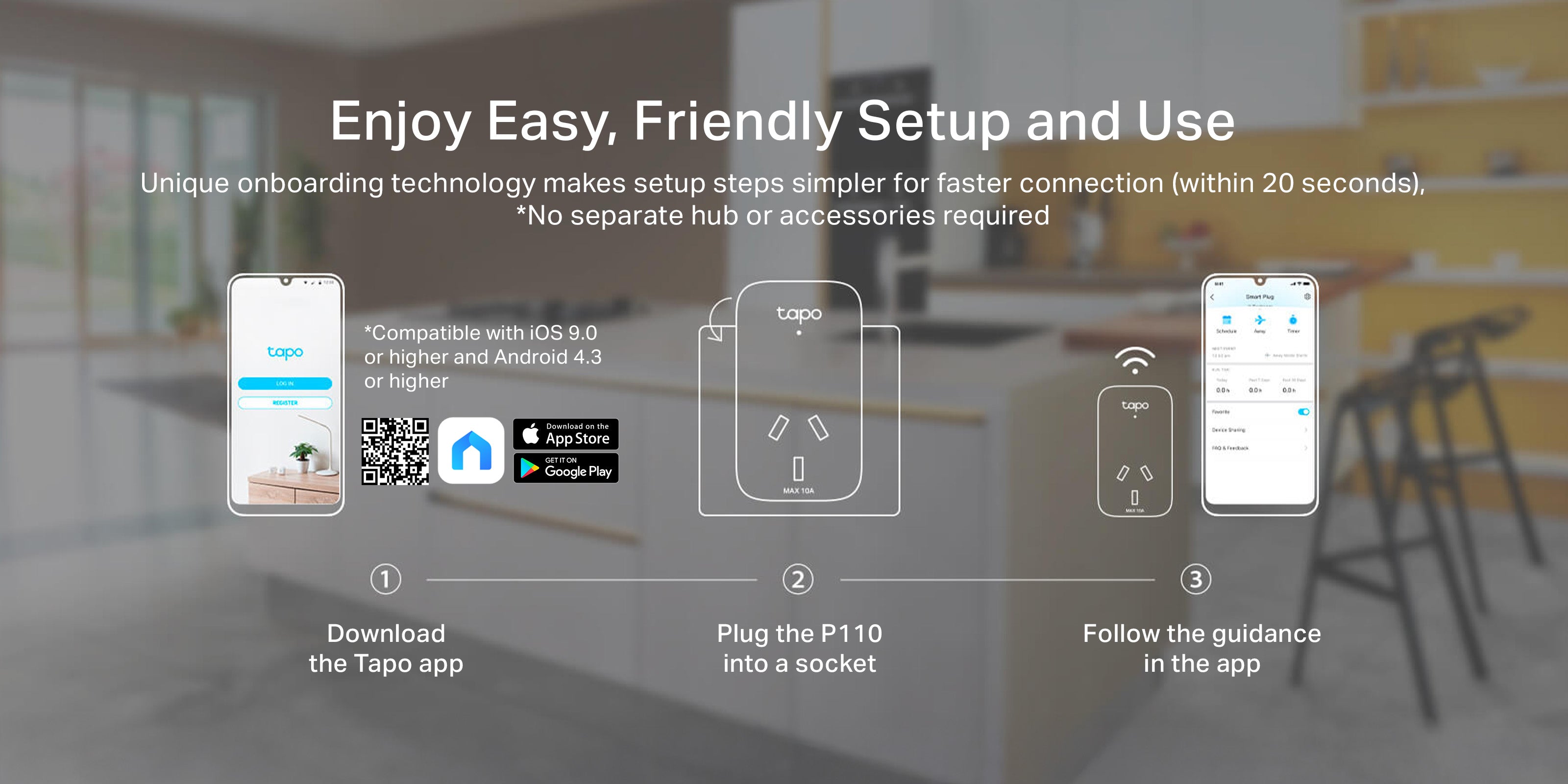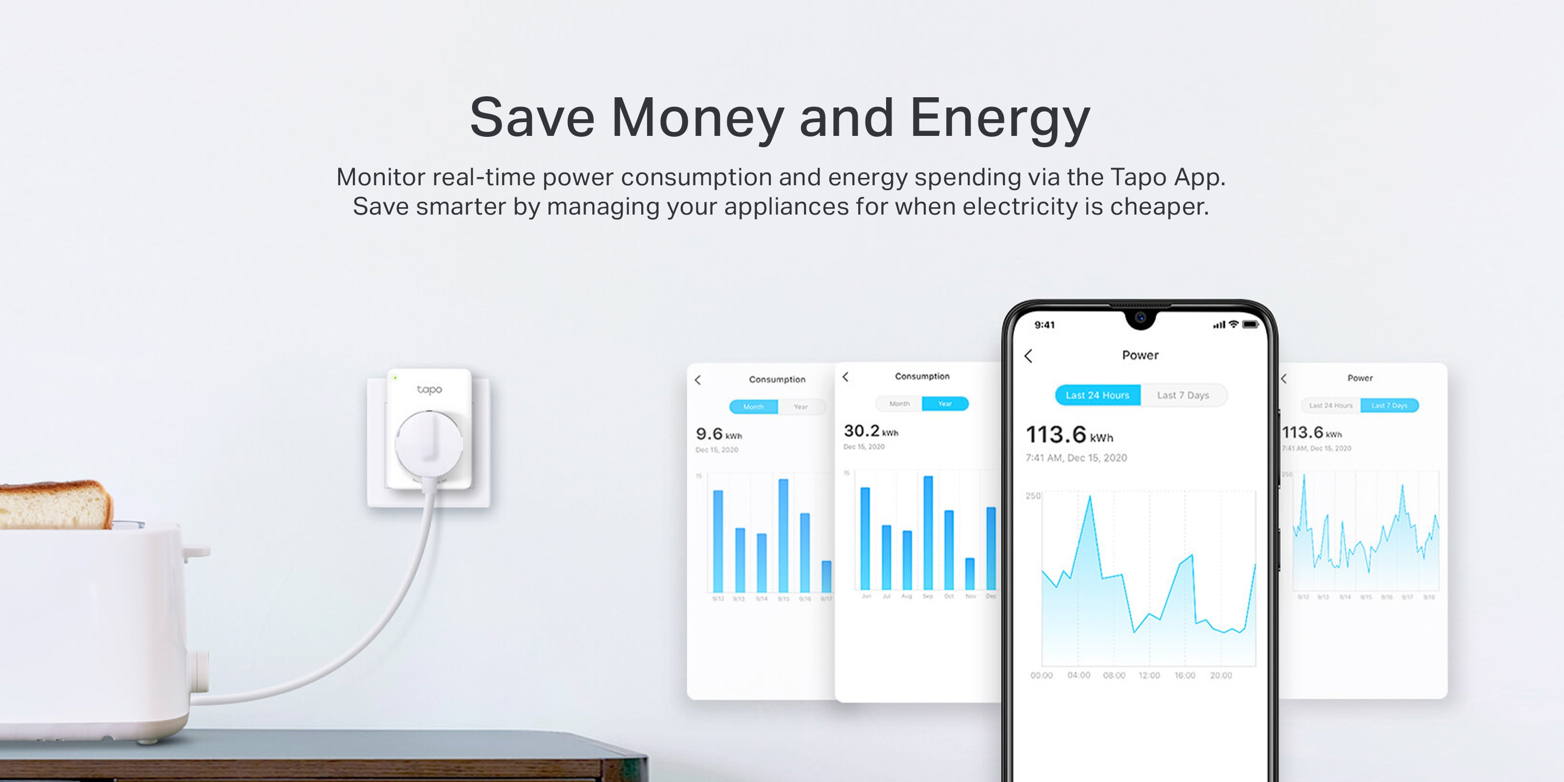 - Energy Monitoring – Monitor real-time power consumption and energy spend via the Tapo App