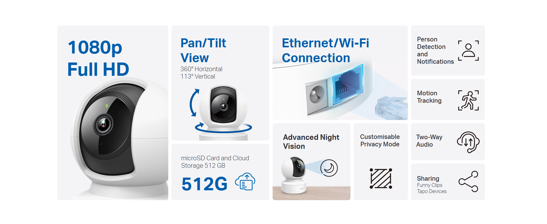 HD pan tilt home camera with 360° horizontal rotation, motion detection alerts, night vision up to 40ft, two-way audio, and local storage up to 512GB.