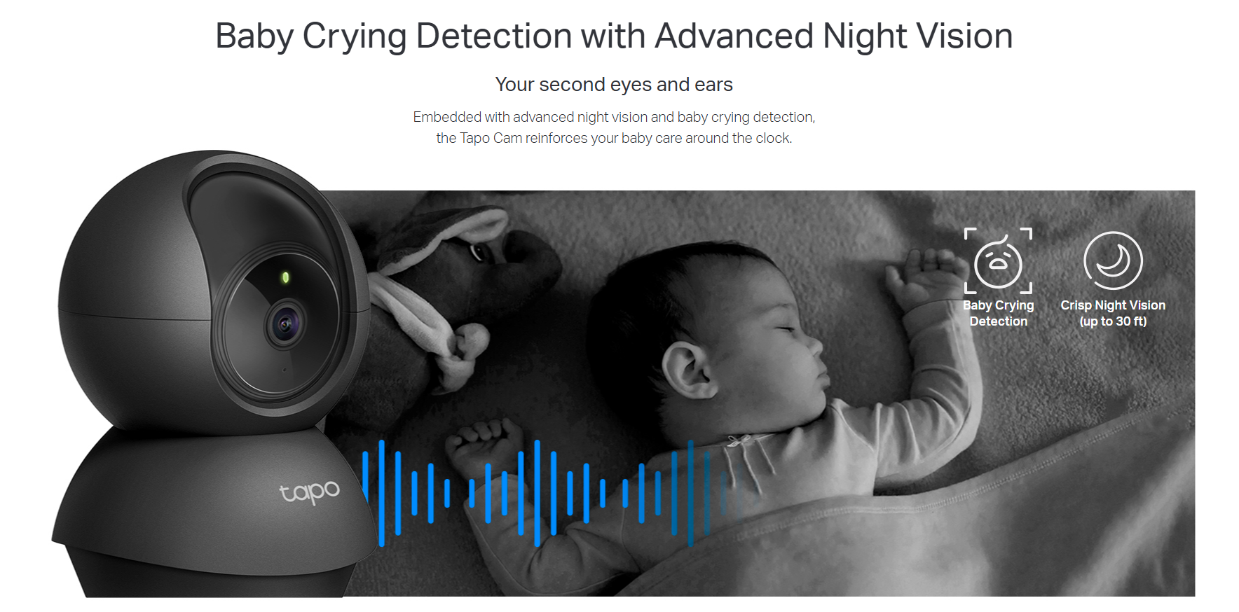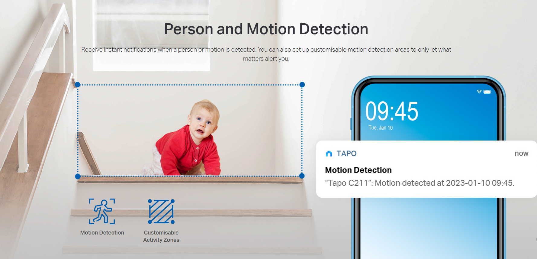 - Detection & Instant Notification: Get instant push notifications when motion baby crying detection or a person is detected .