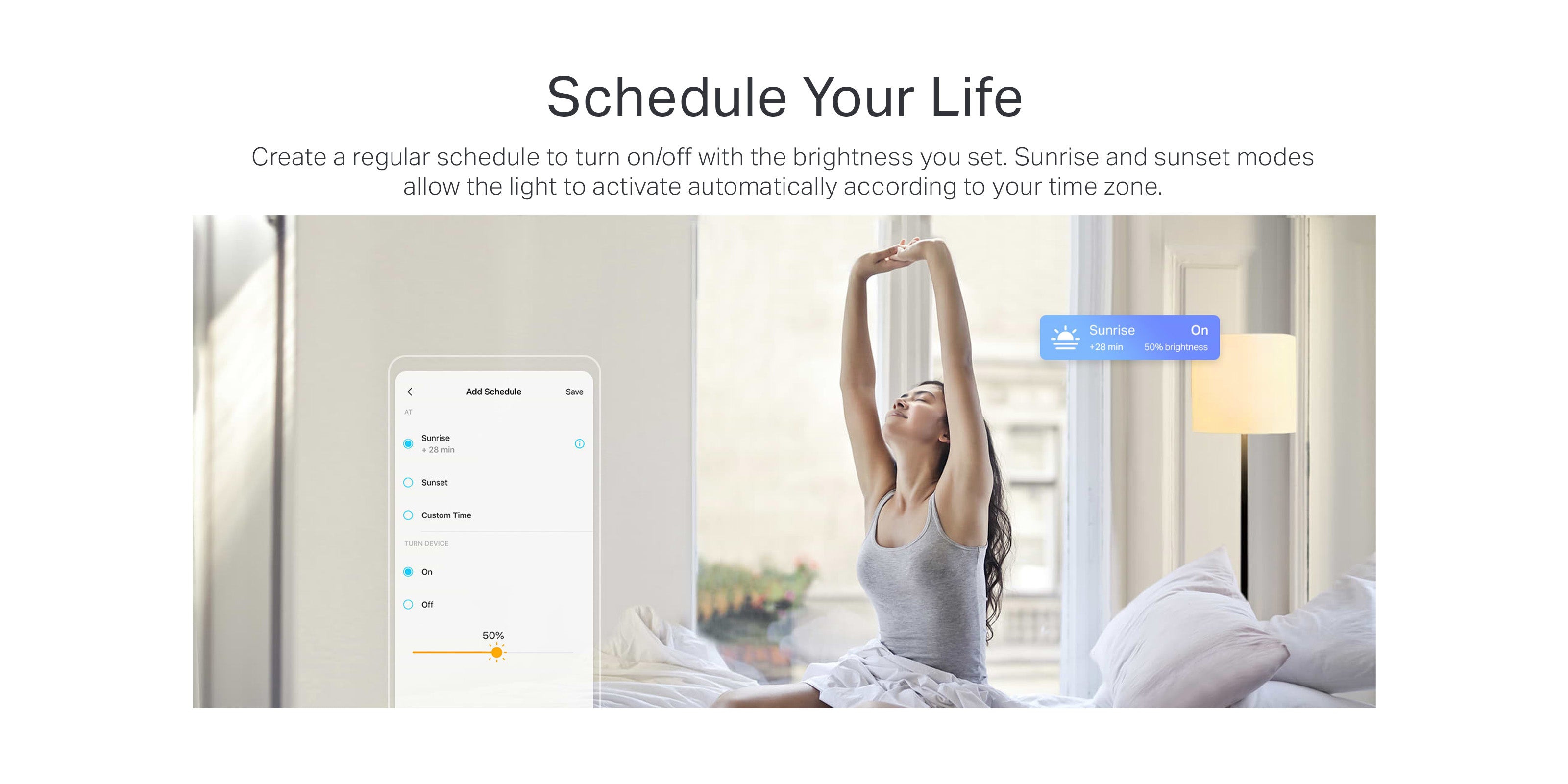 - Schedule (Set Your Times) – Create a regular schedule to turn on/off with the brightness you set