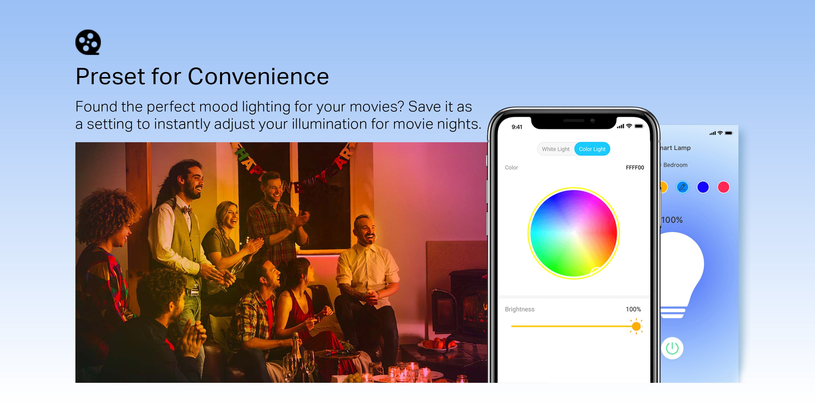 - Preset for Convenience – Found your favourite lighting for watching movies? Save it as a setting you can simply select for future movie nights.