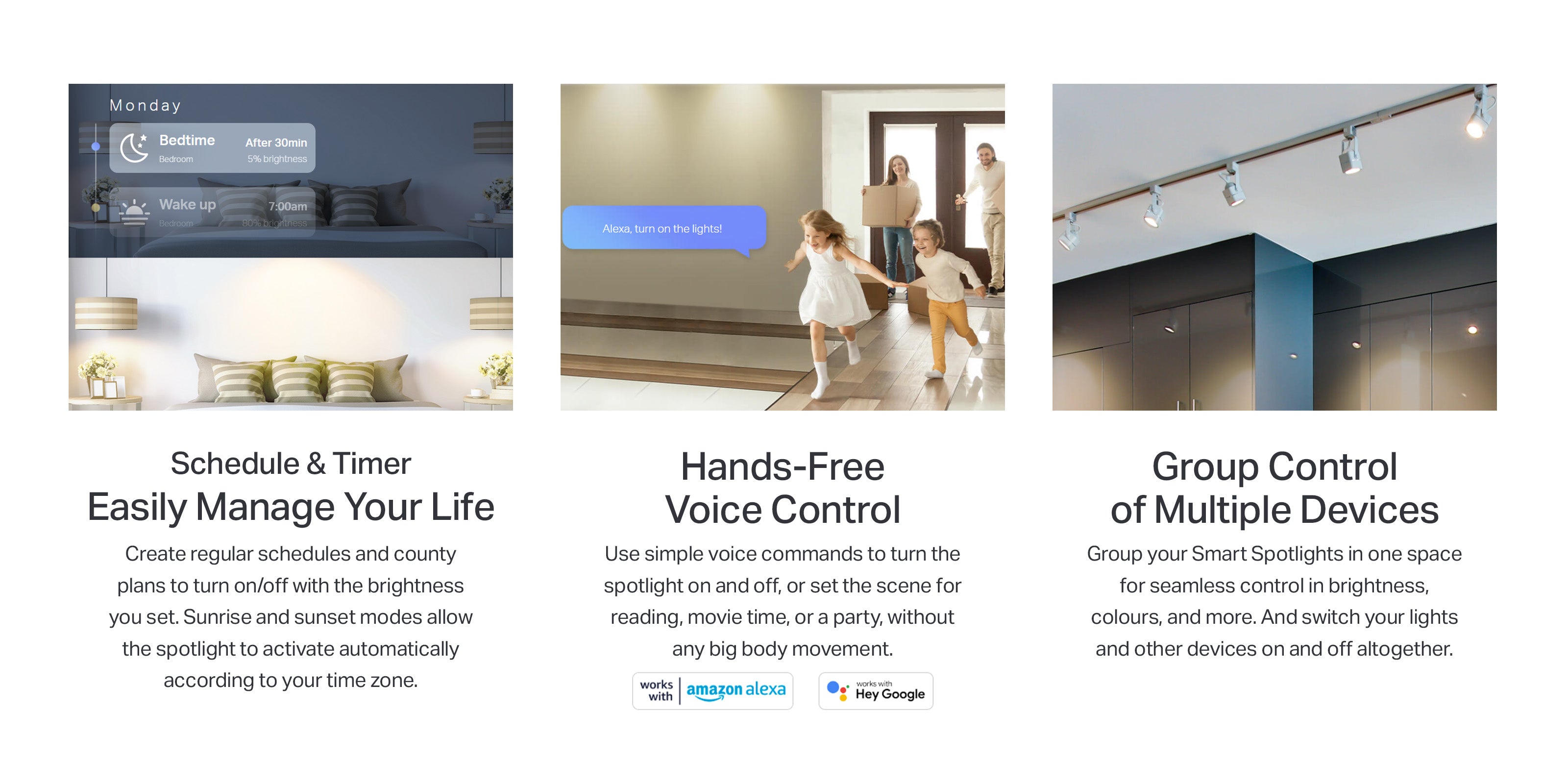 - Voice Control - Manage your Smart Spotlights with voice commands via Amazon Alexa or Google Assistant.