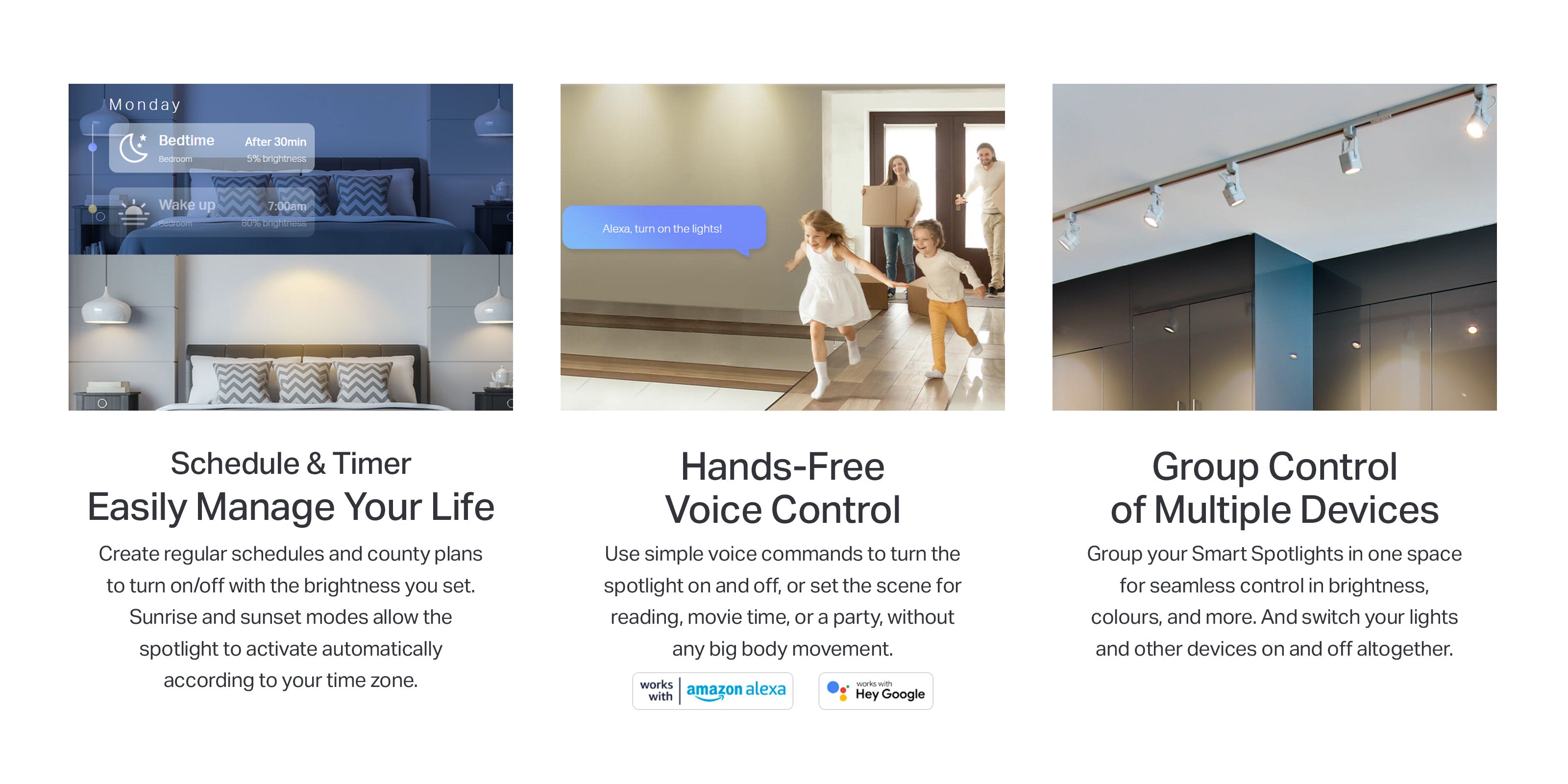 - Voice Control - Manage your smart spotlights with voice commands via Amazon Alexa or Google Assistant.