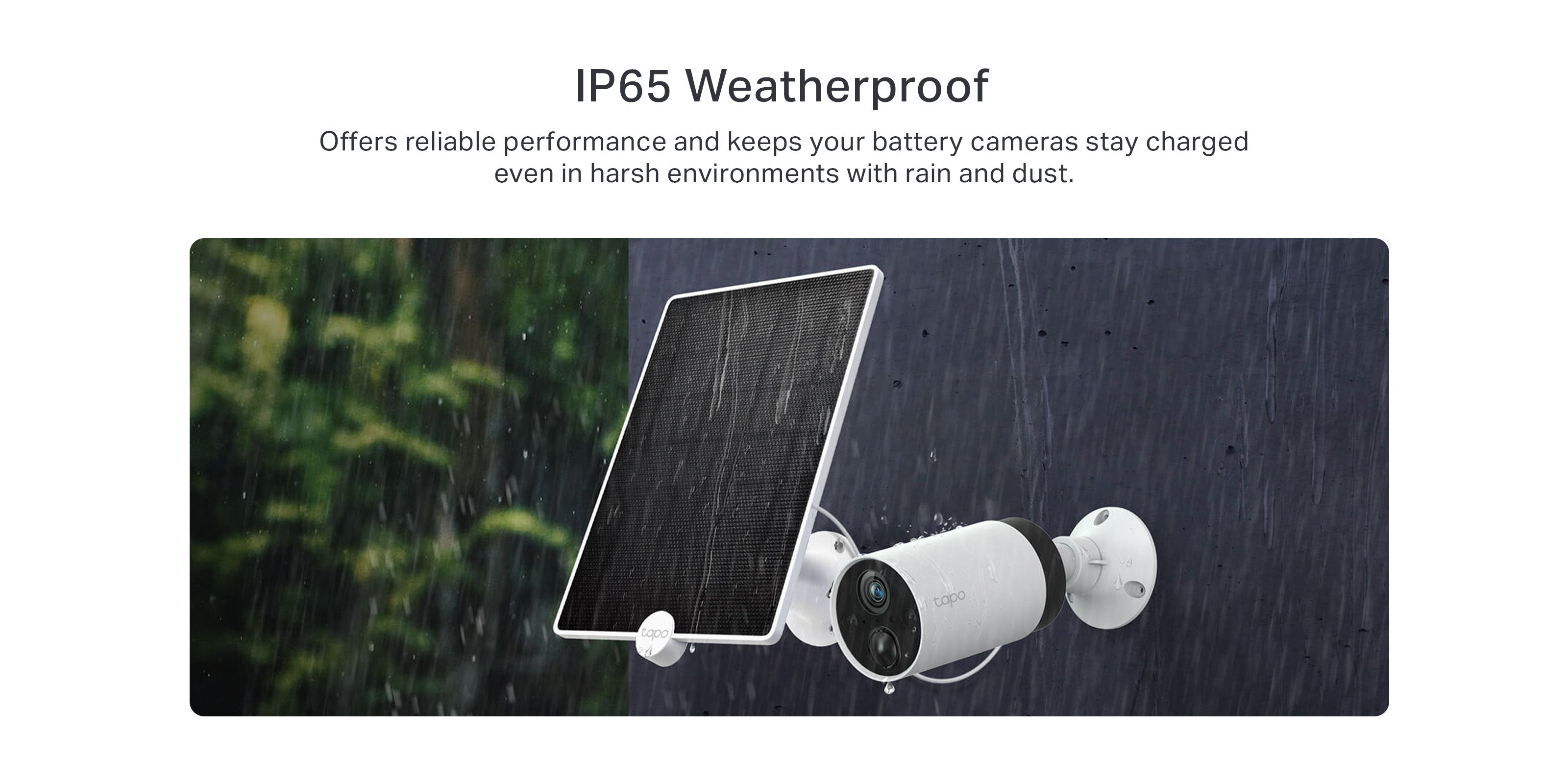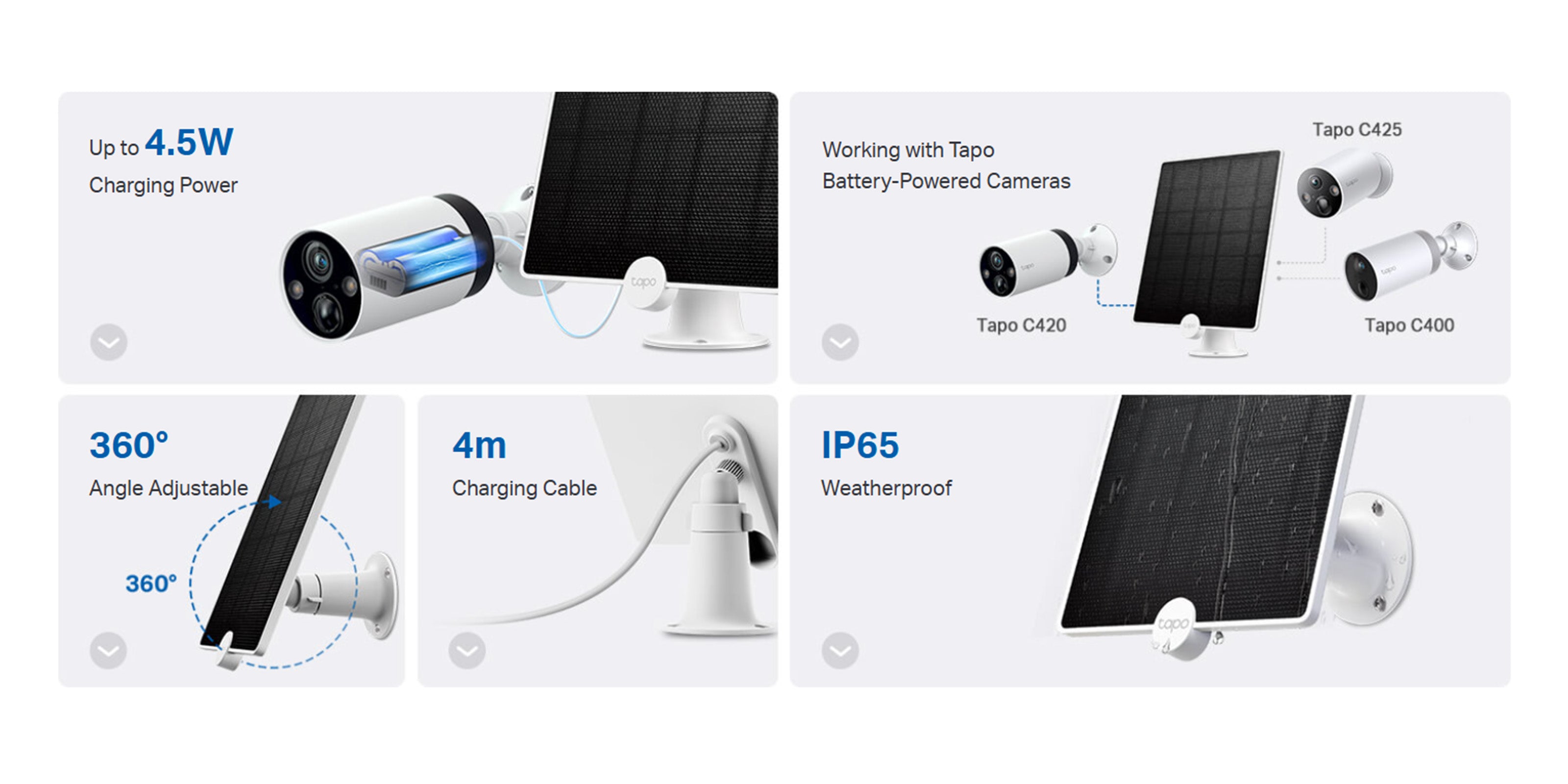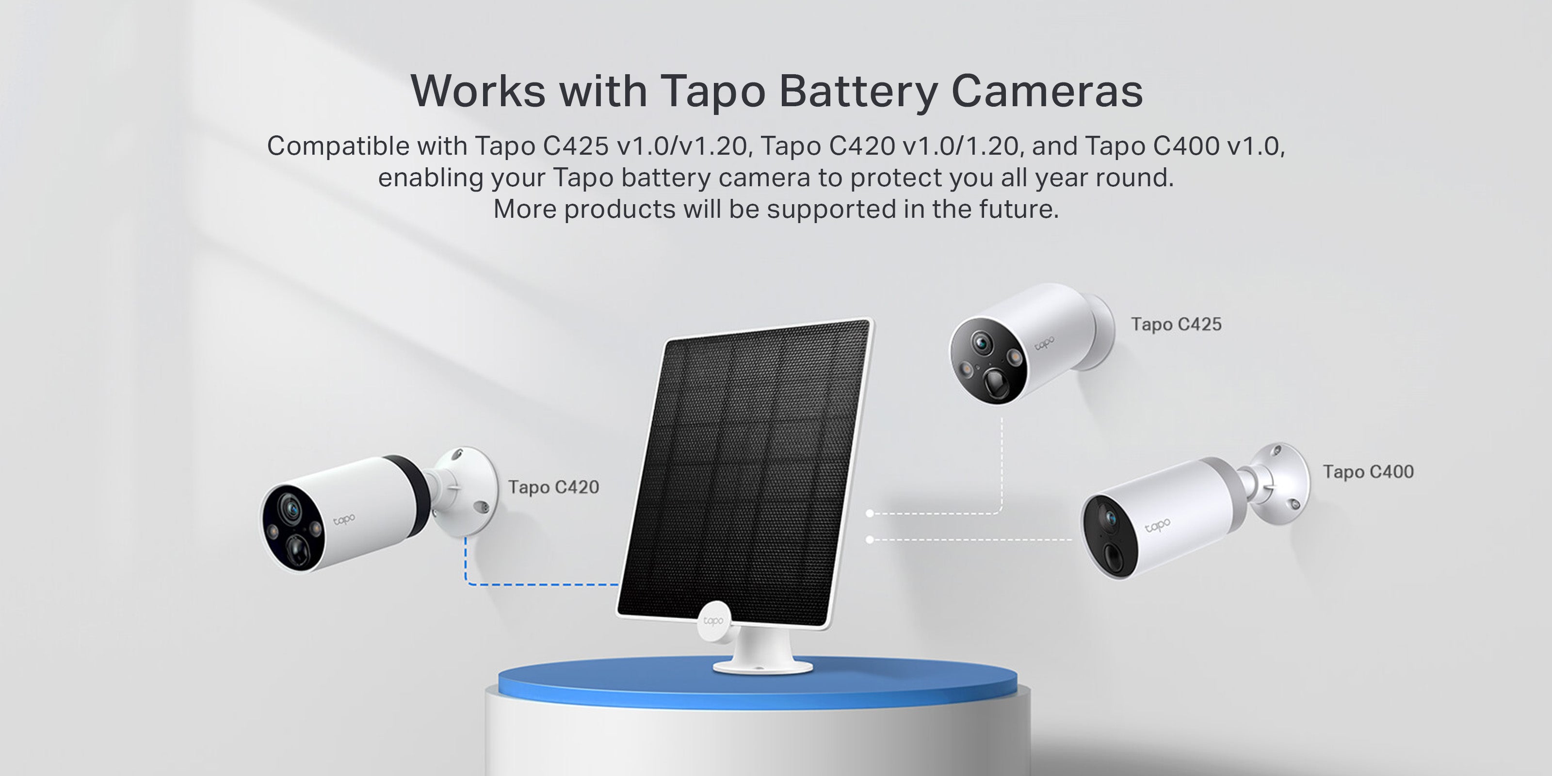 - Non-Stop Solar Power-Captures free, clean solar energy and provides non-stop power supply for your Tapo battery-powered cameras (Tapo C425, Tapo C420, Tapo C400 and TC85) to ensure they protect you all year round.