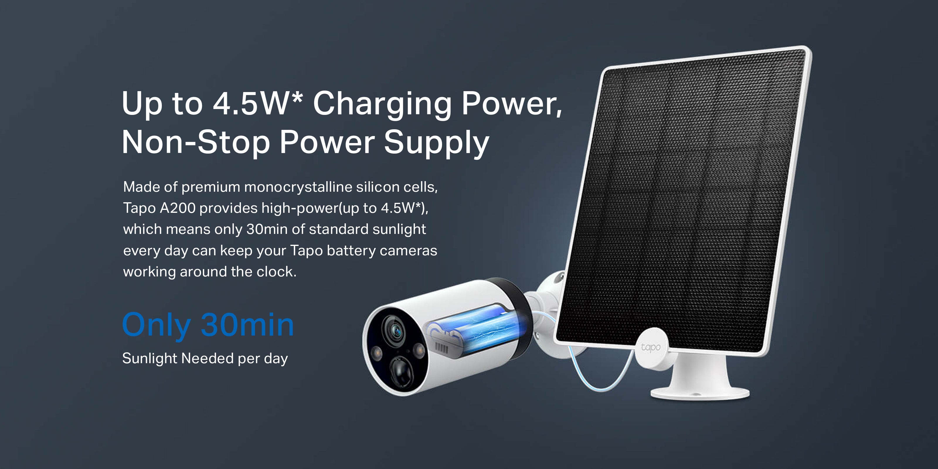 - Up to 4.5W Charging Power-Made of premium monocrystalline silicon cells, Tapo A200 captures plentiful solar energy and provides continuous power supply efficiently.