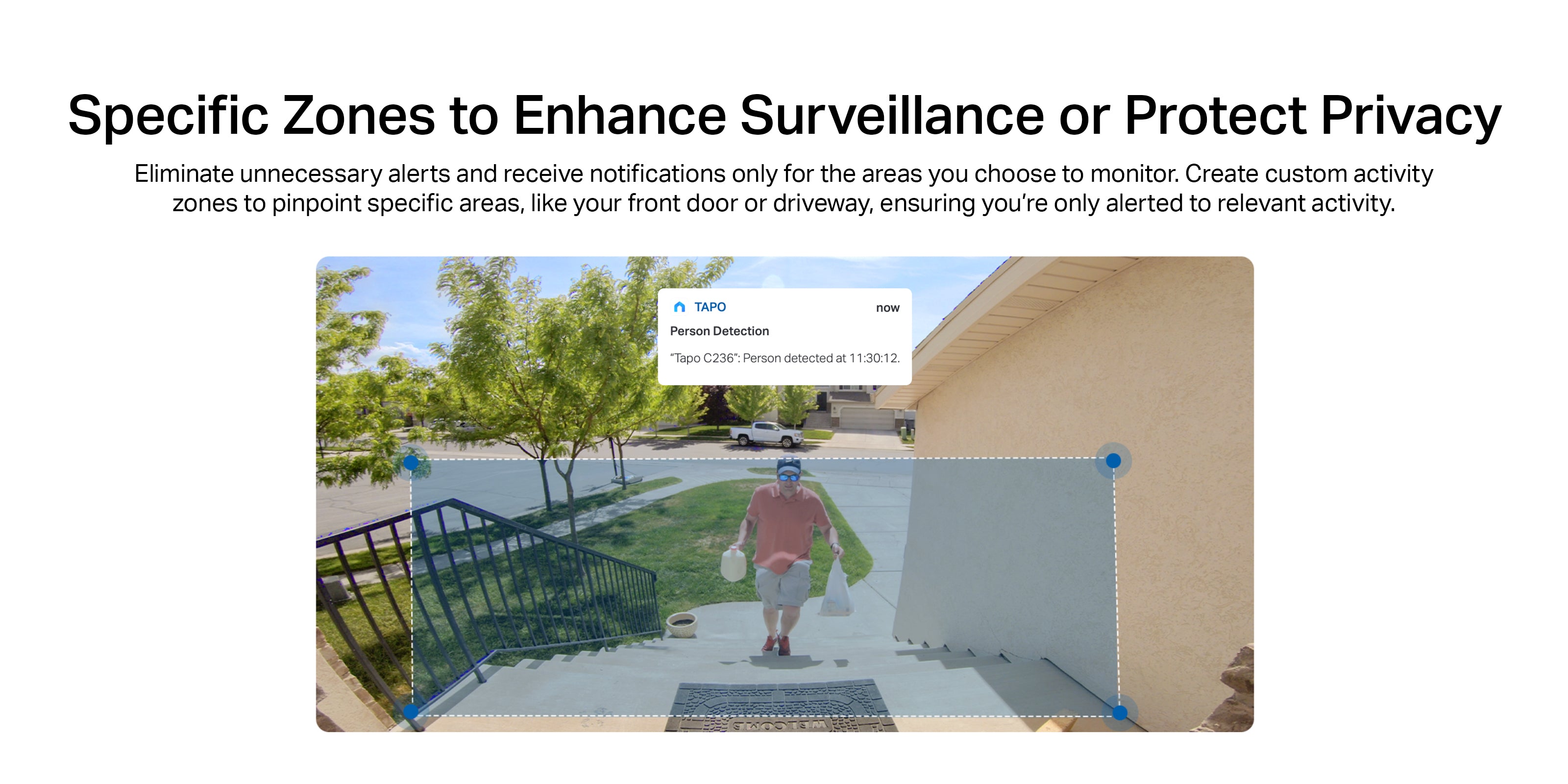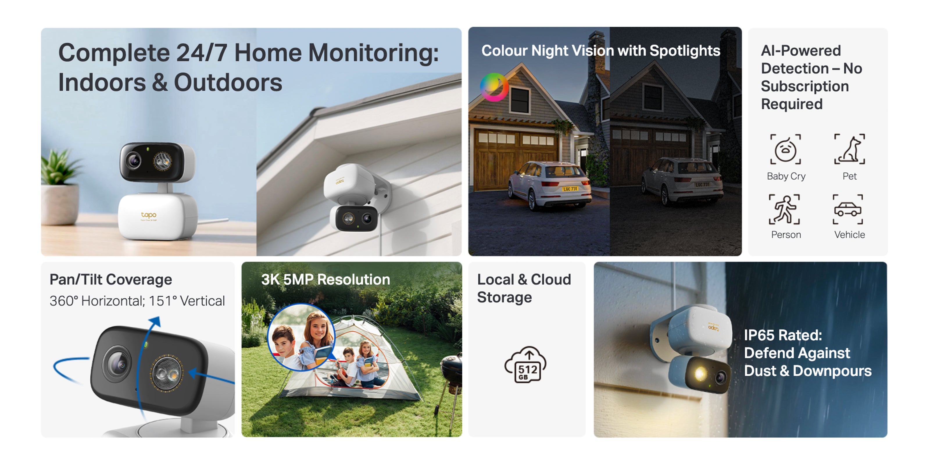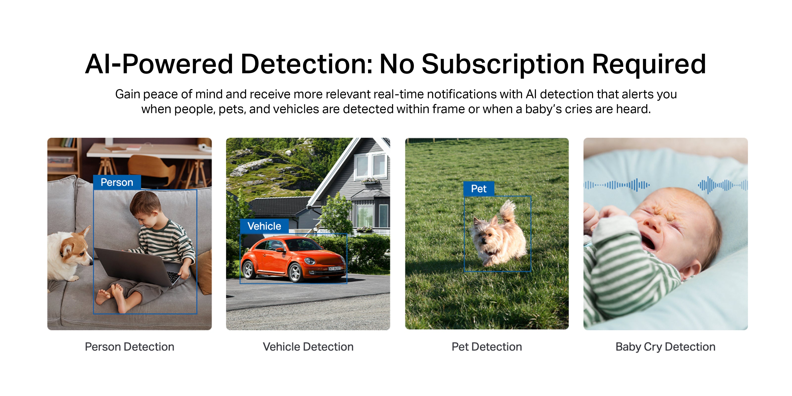 - Smart AI Detection and Notifications: Identifies people, pets, vehicle and baby cry to minimise unnecessary notifications.