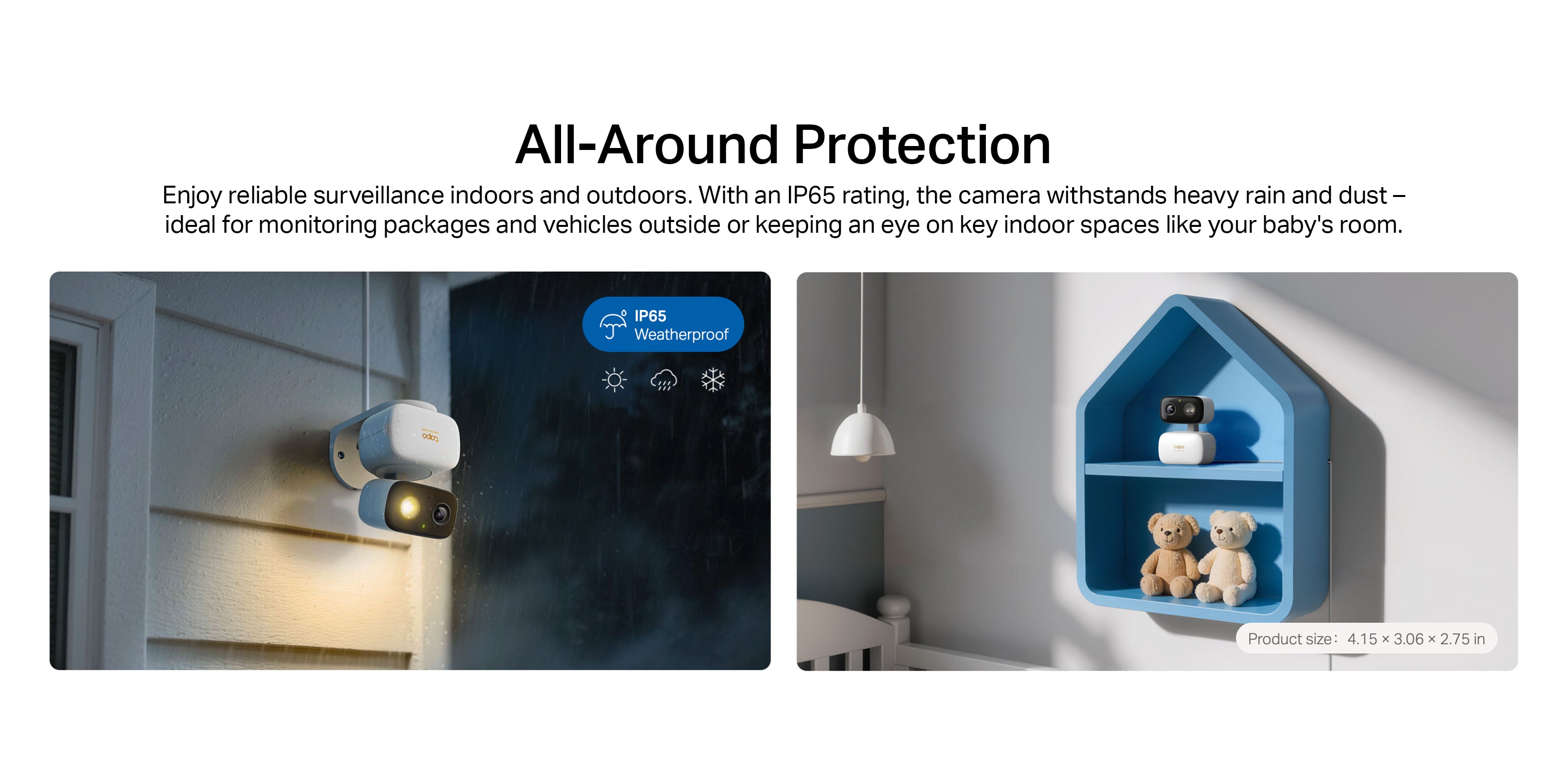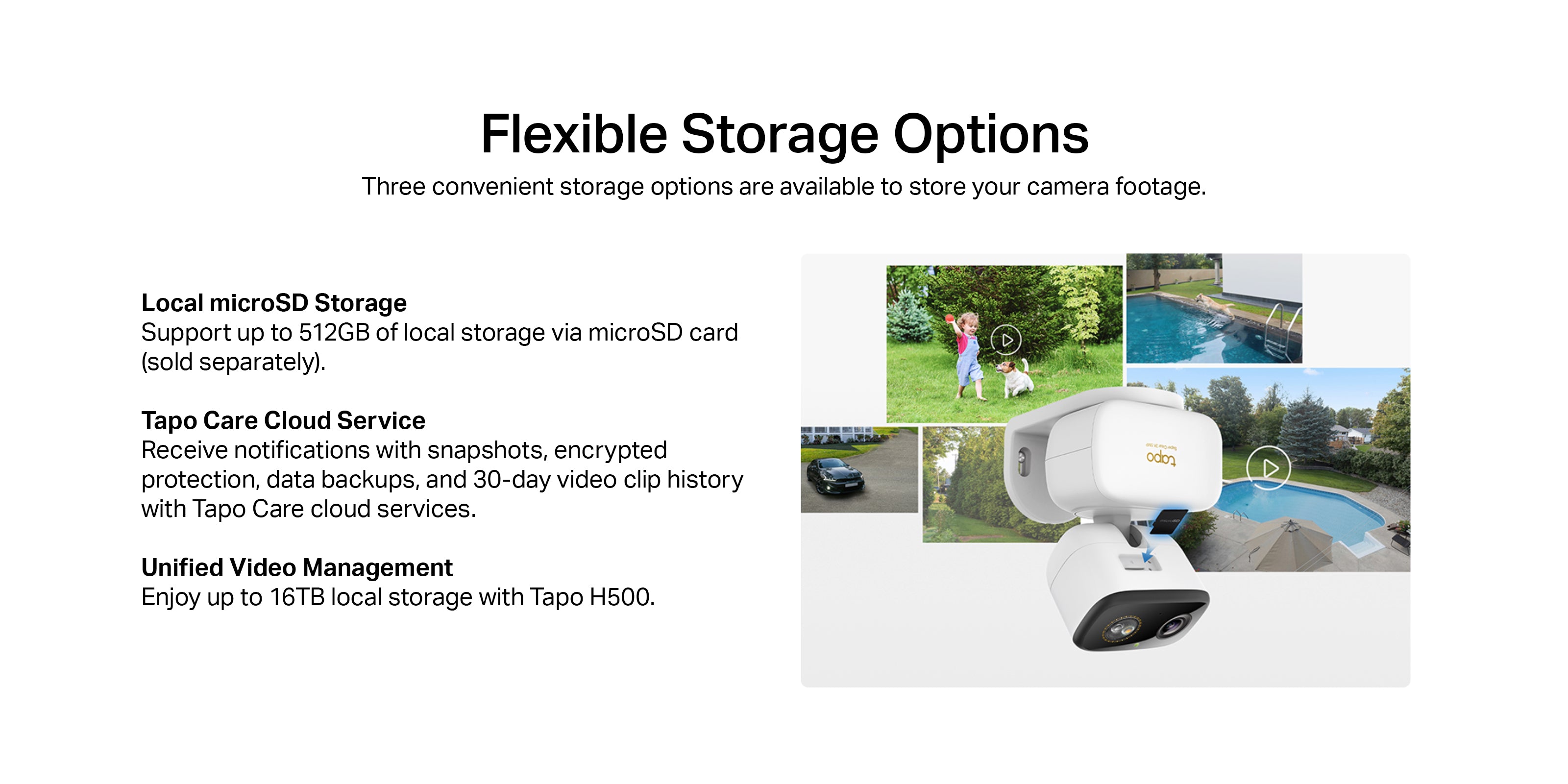 - Local and Cloud Storage: Save recorded videos to a microSD card (up to 512 GB) or by using Tapo Care cloud storage services.