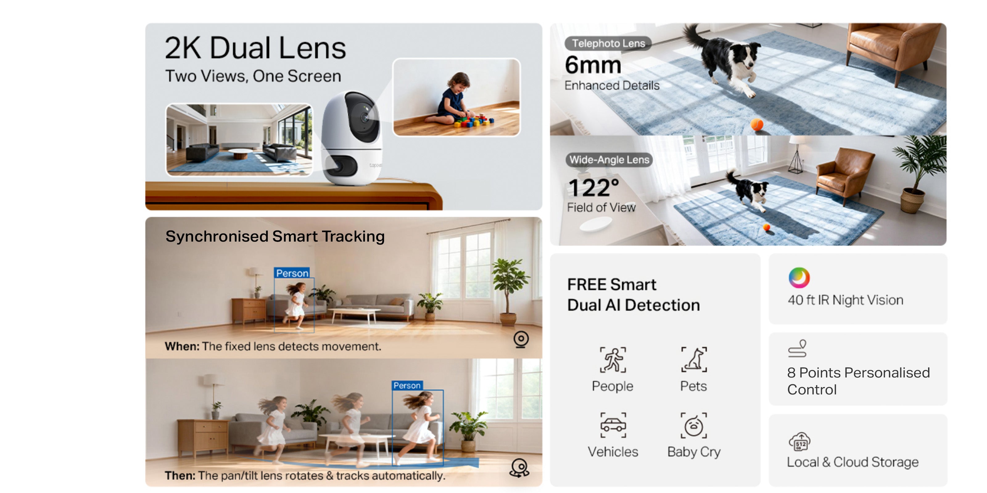 Delivers dual 2K 3MP clarity with wide-angle and telephoto lenses for full coverage, synchronized smart tracking, one-tap focus, and free AI detection. Features night vision, two-way audio, works with Alexa/Google Home/SmartThings, and offers secure local or cloud storage.