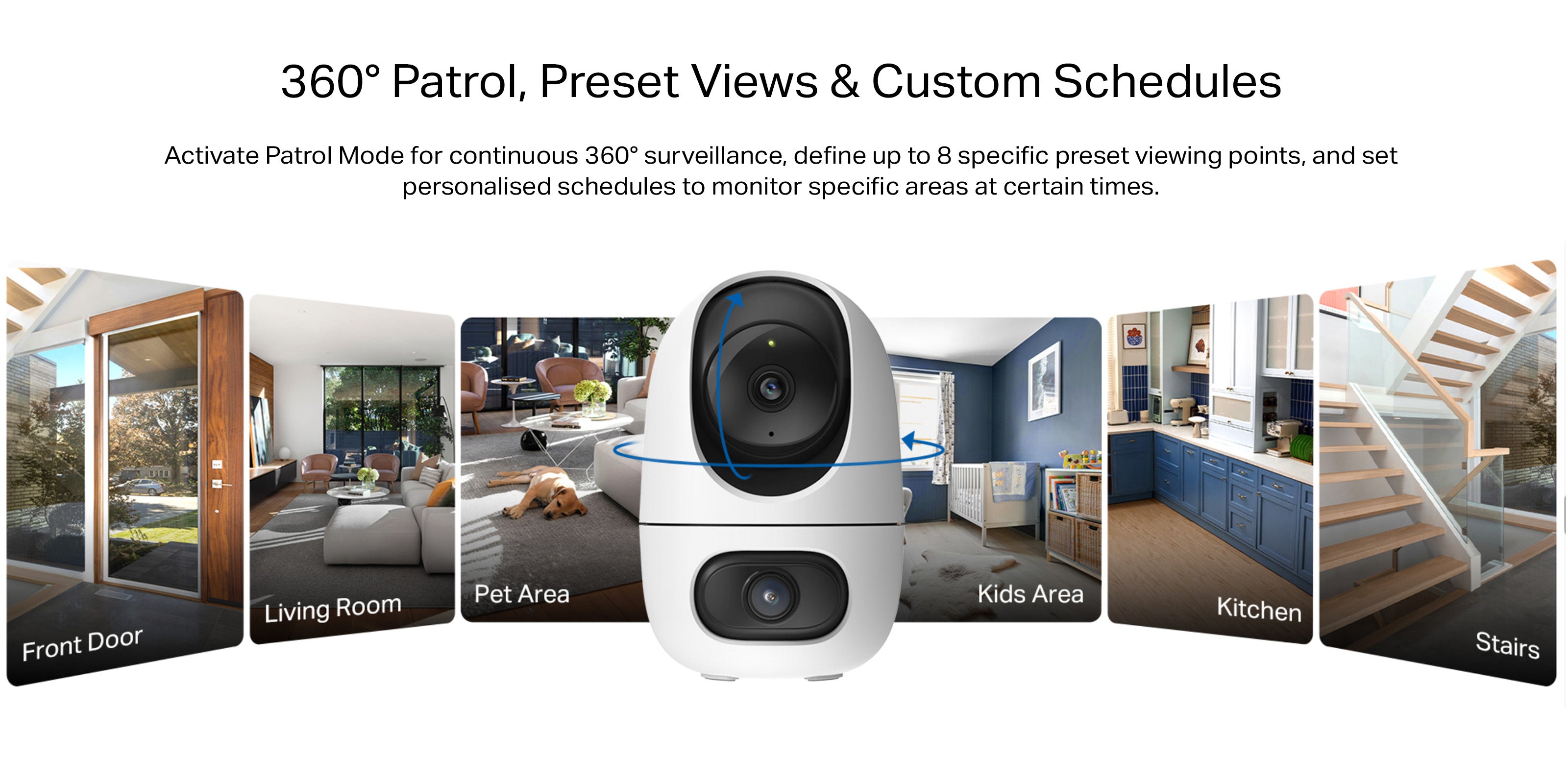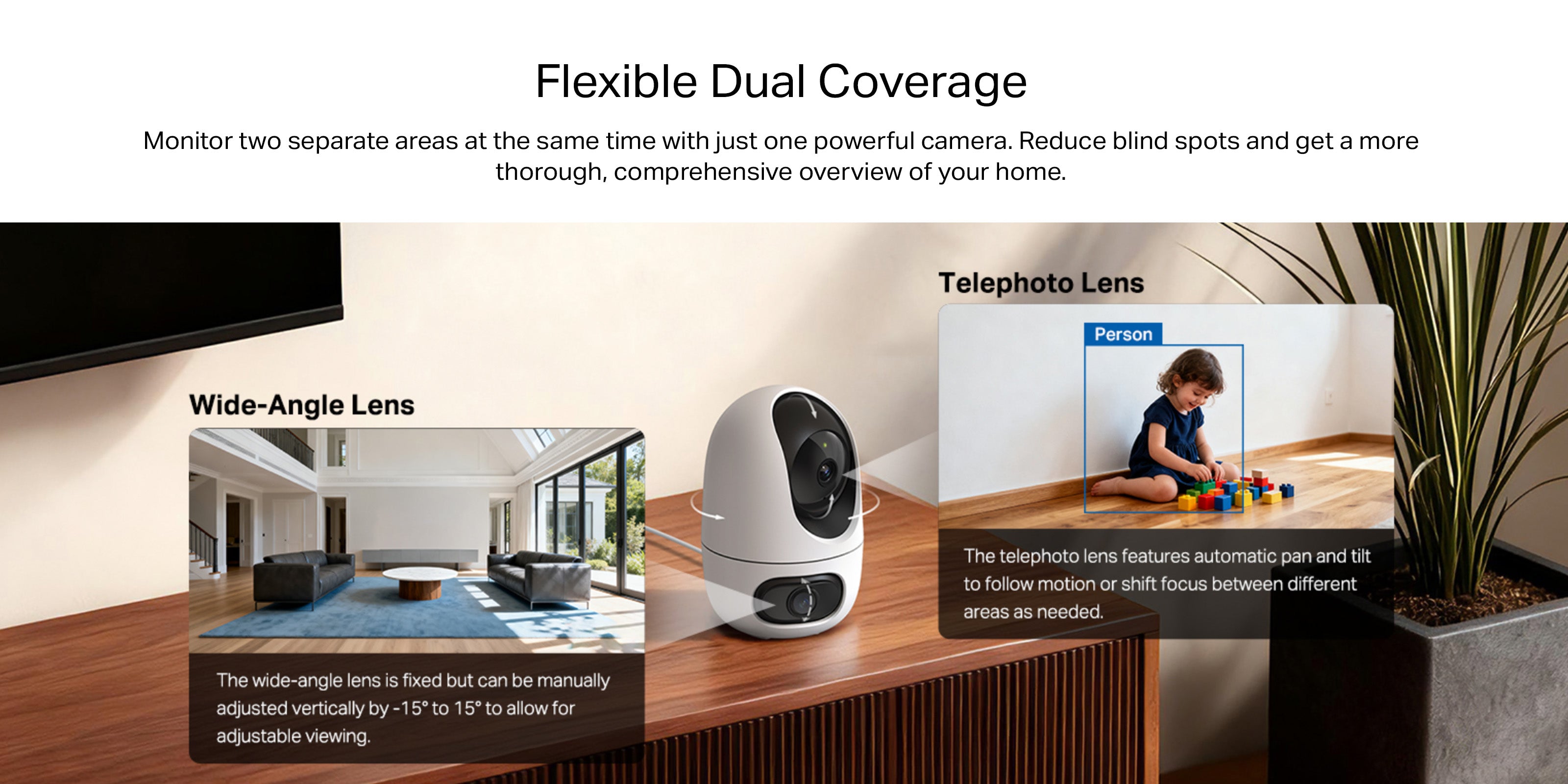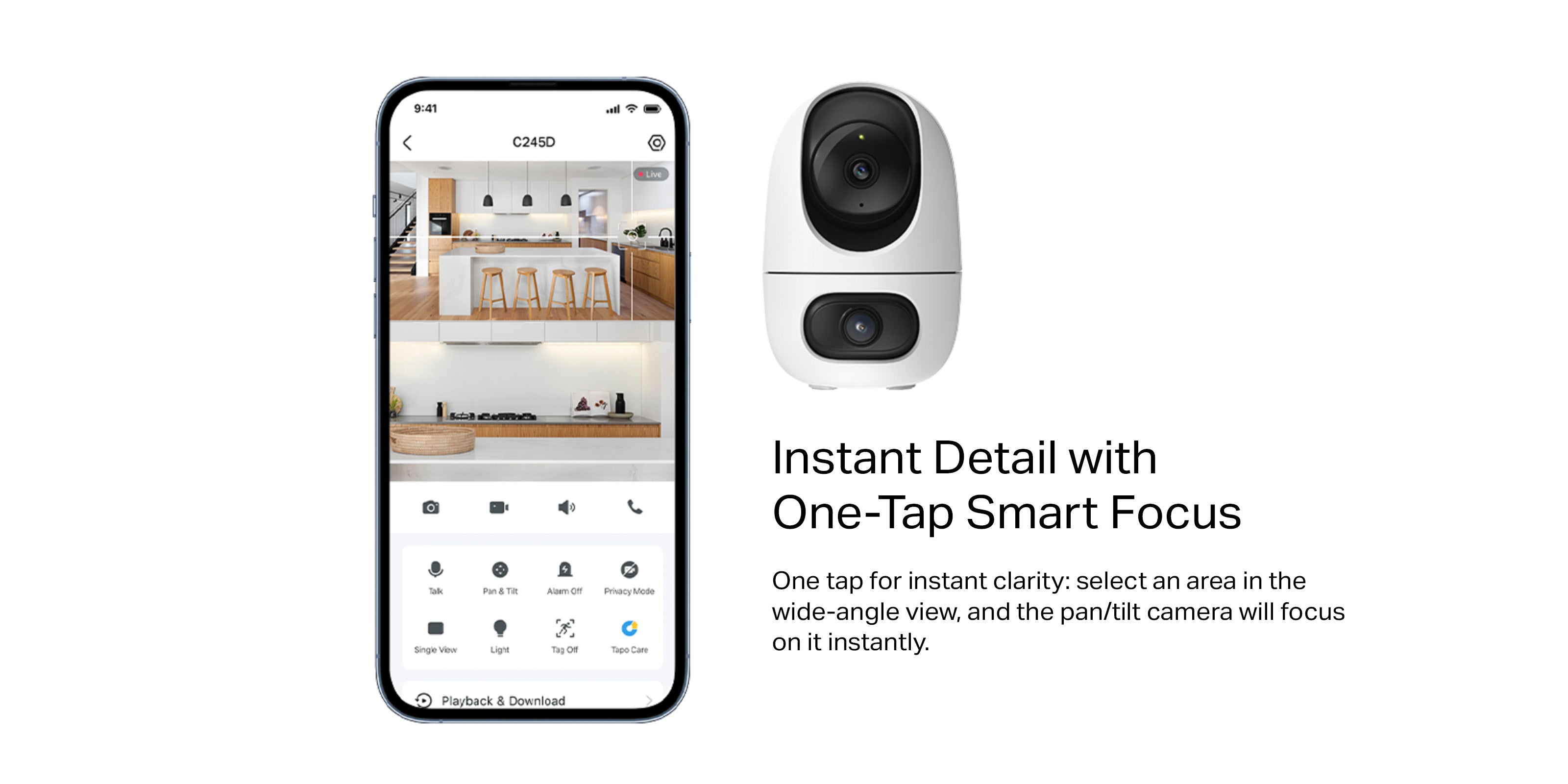 - One-Tap Smart Focus - Select an area in the wide-angle view, and the pan/tilt camera will focus on it instantly.