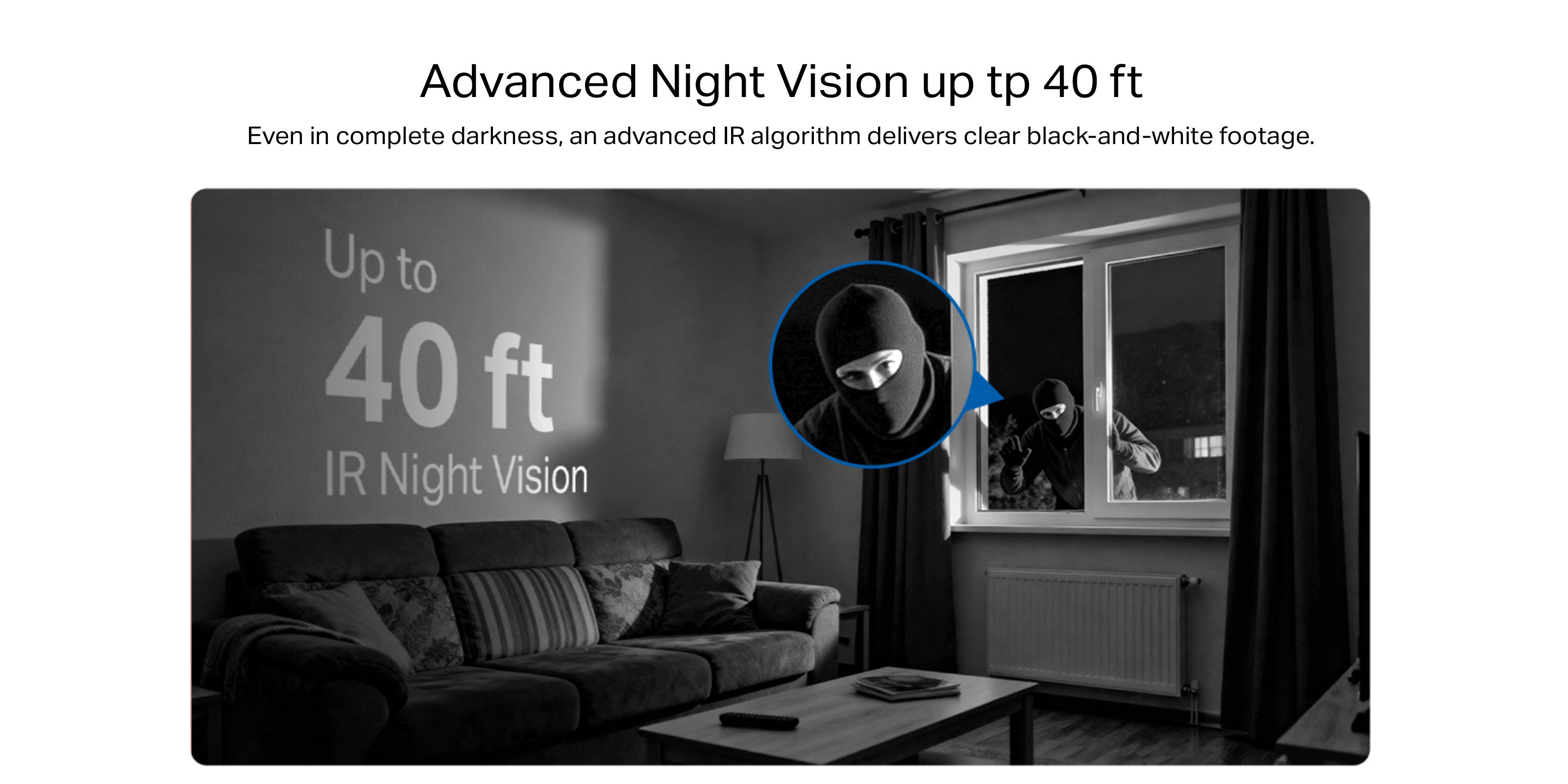 - Night Vision up to 40 ft -Even in complete darkness, an advanced IR algorithm delivers clear black-and-white footage.