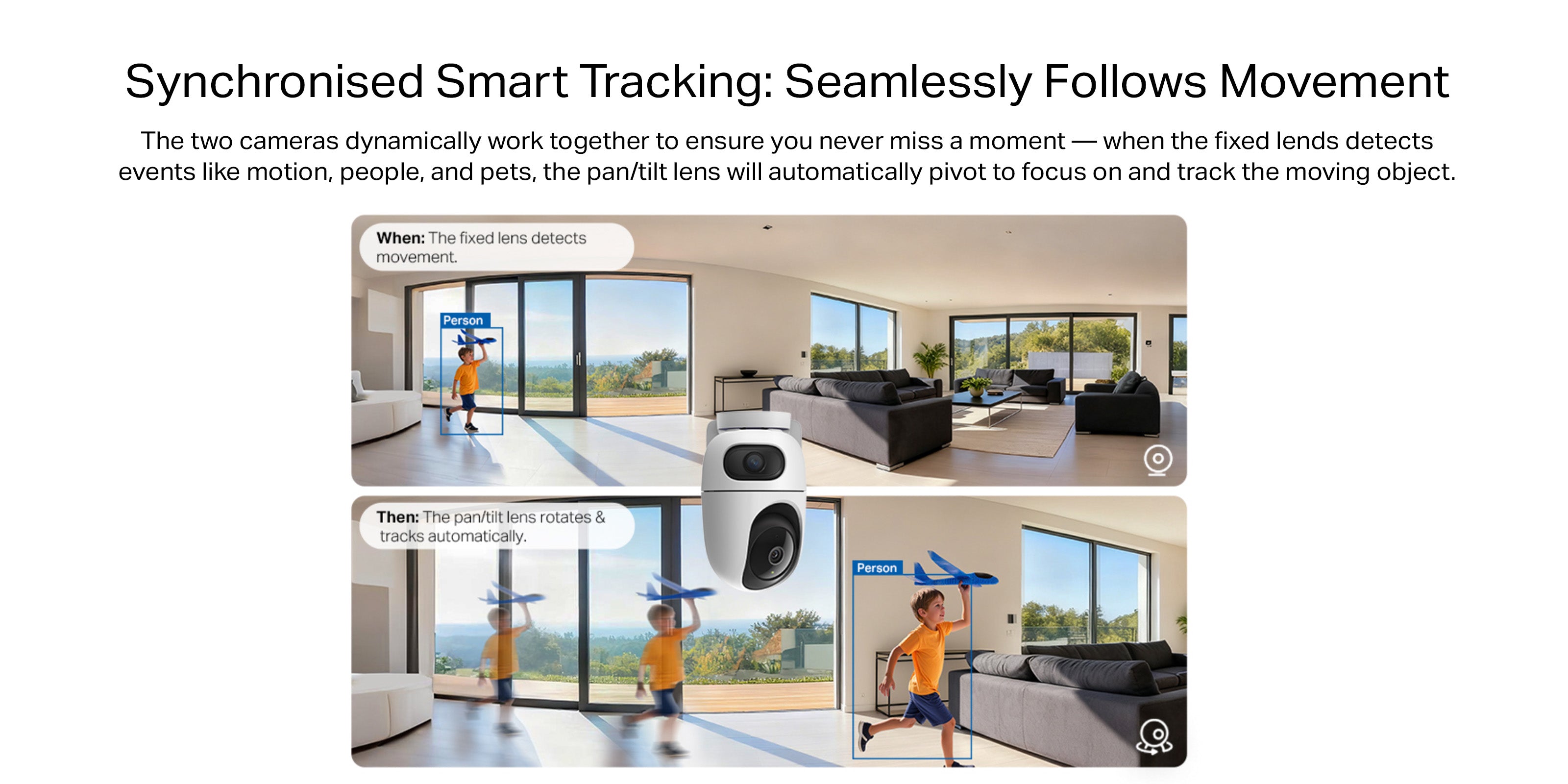 - Synchronized Smart Tracking - When the fixed lens detects events, the pan/tilt lens will automatically pivot to focus on and track the moving object.