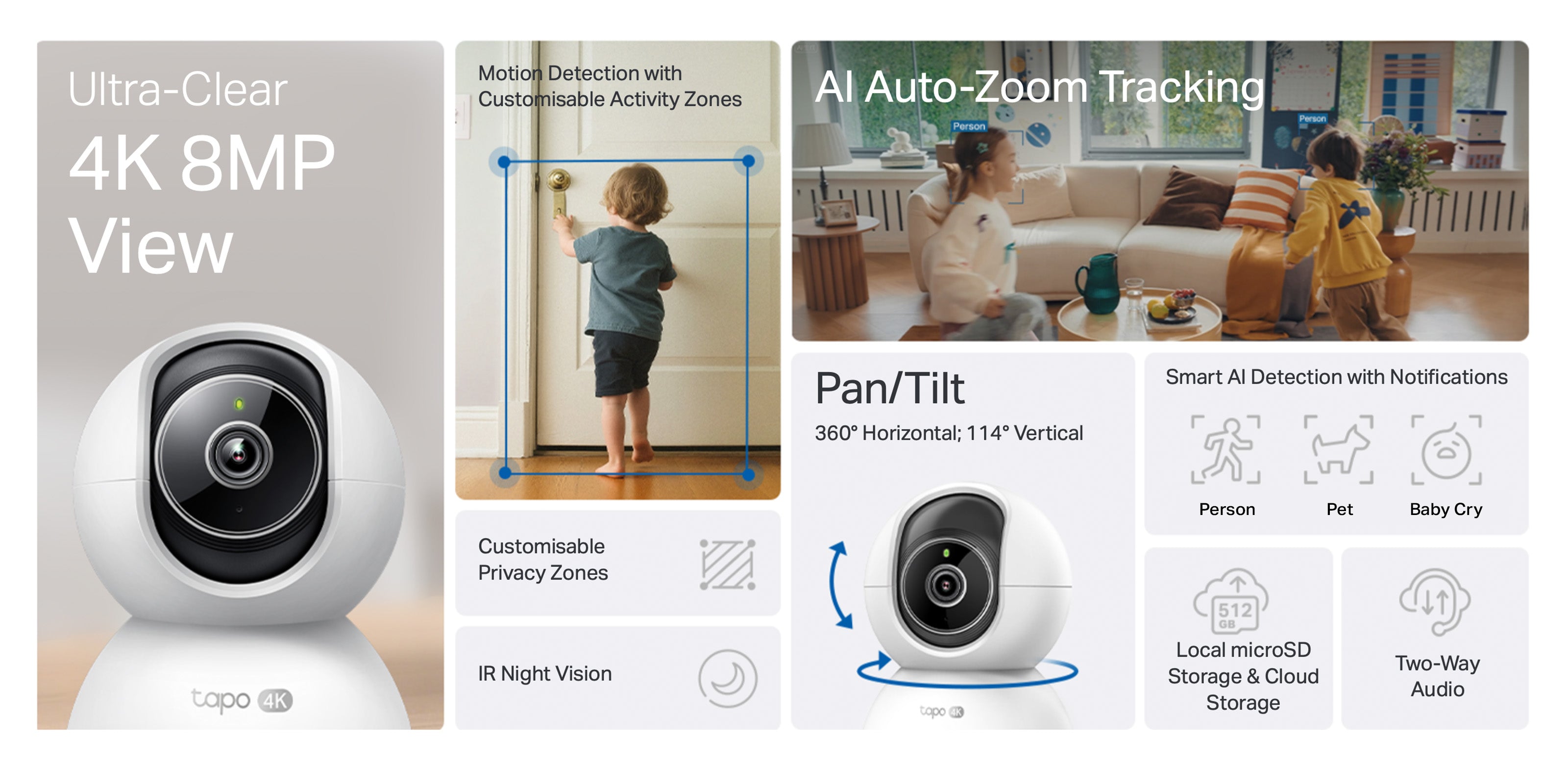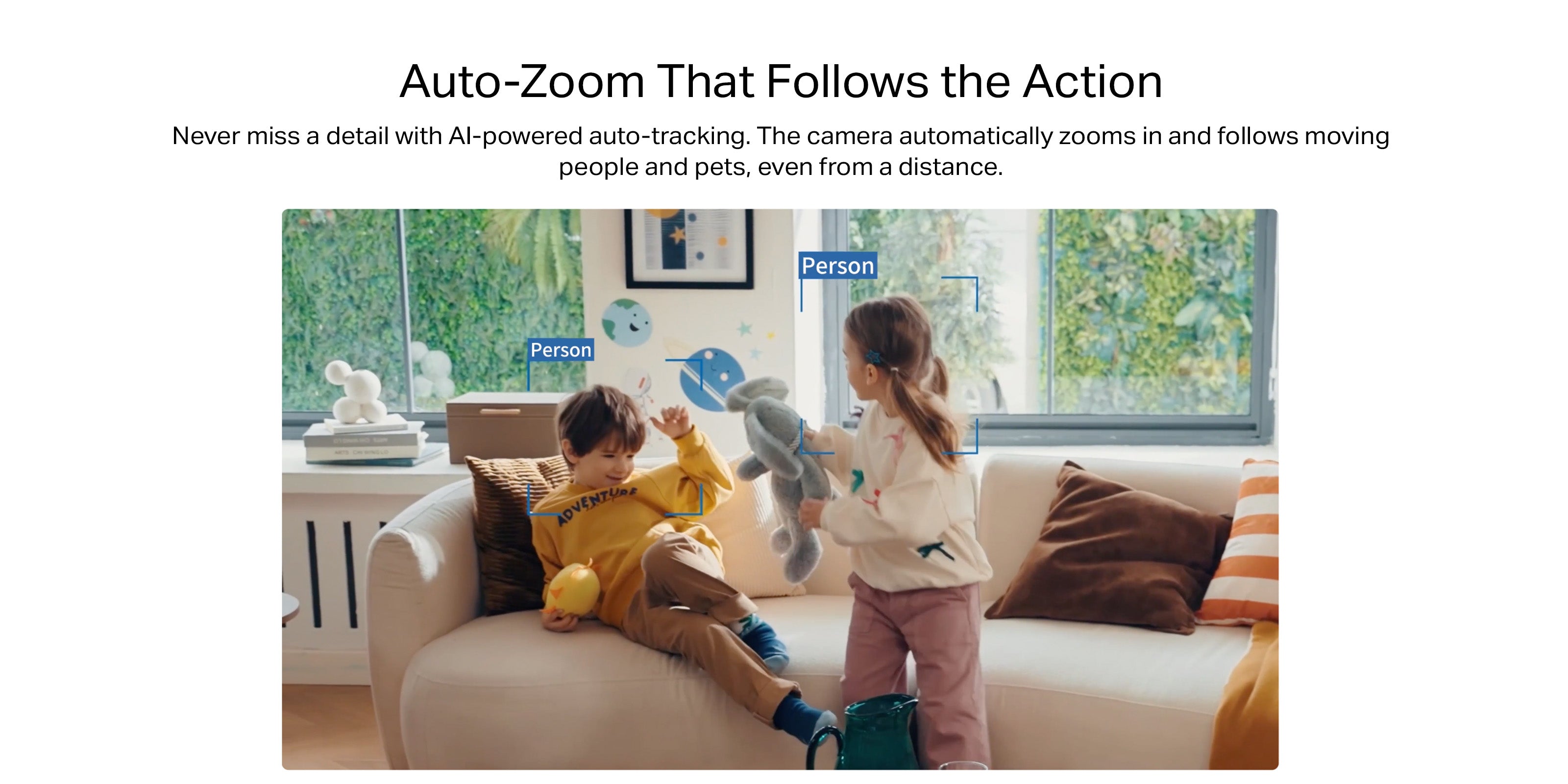 - AI Auto-Zoom Tracking: The camera automatically zooms in and follows moving people and pets, even from a distance.