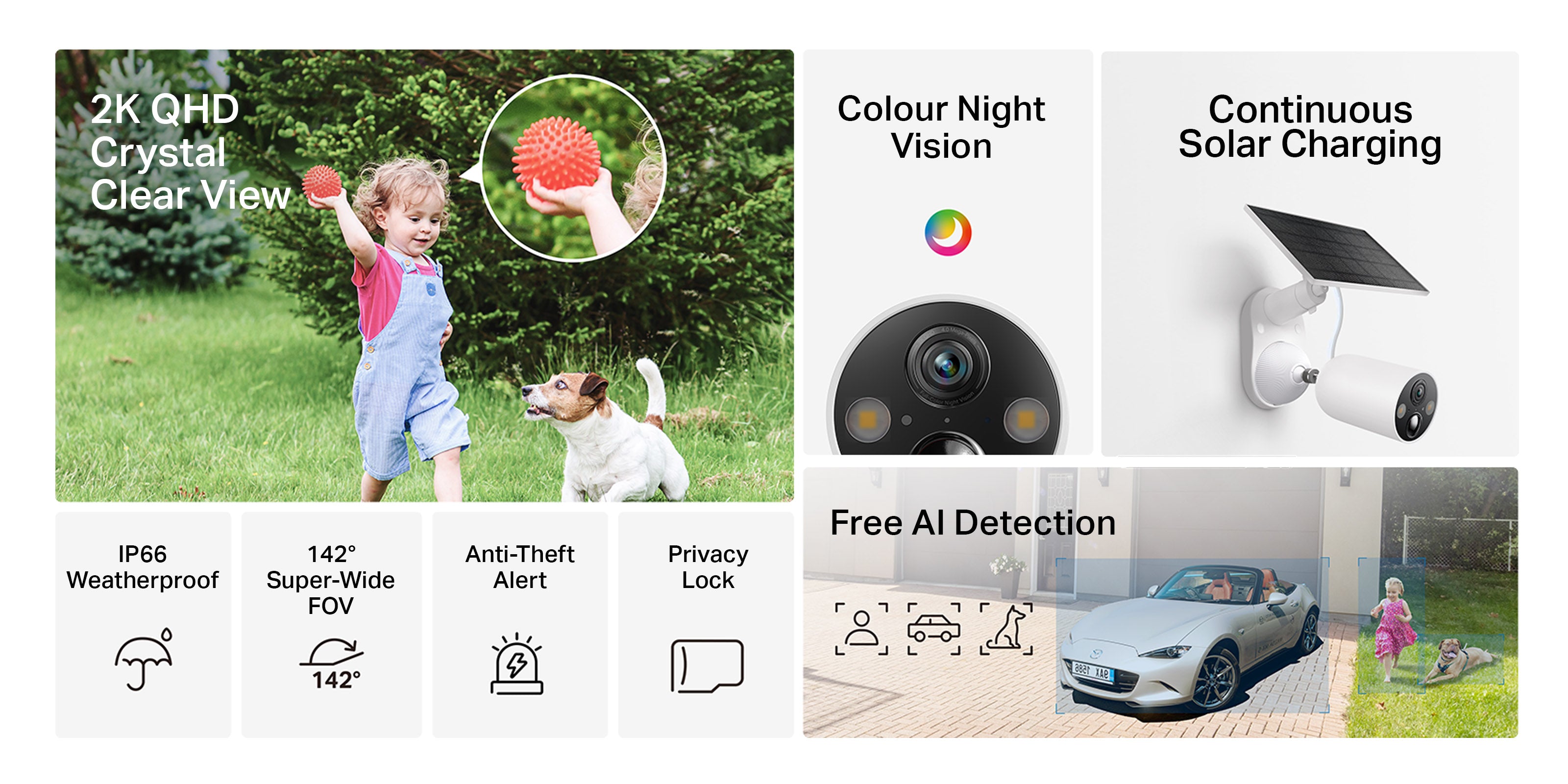 2K QHD solar-powered outdoor security camera kit with colour night vision, free AI detection, anti-theft alerts, and IP66 weatherproof protection for reliable, maintenance-free monitoring.