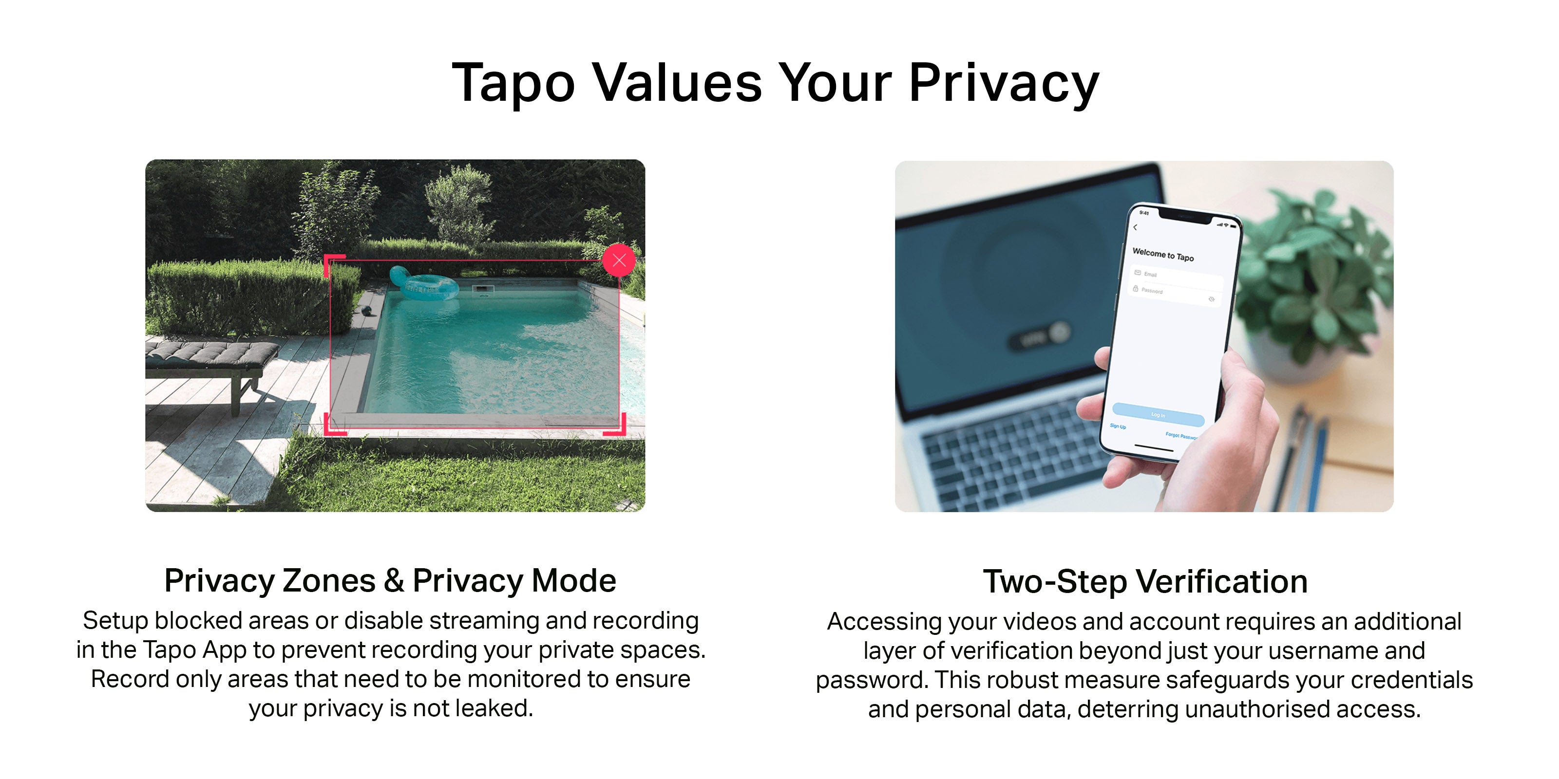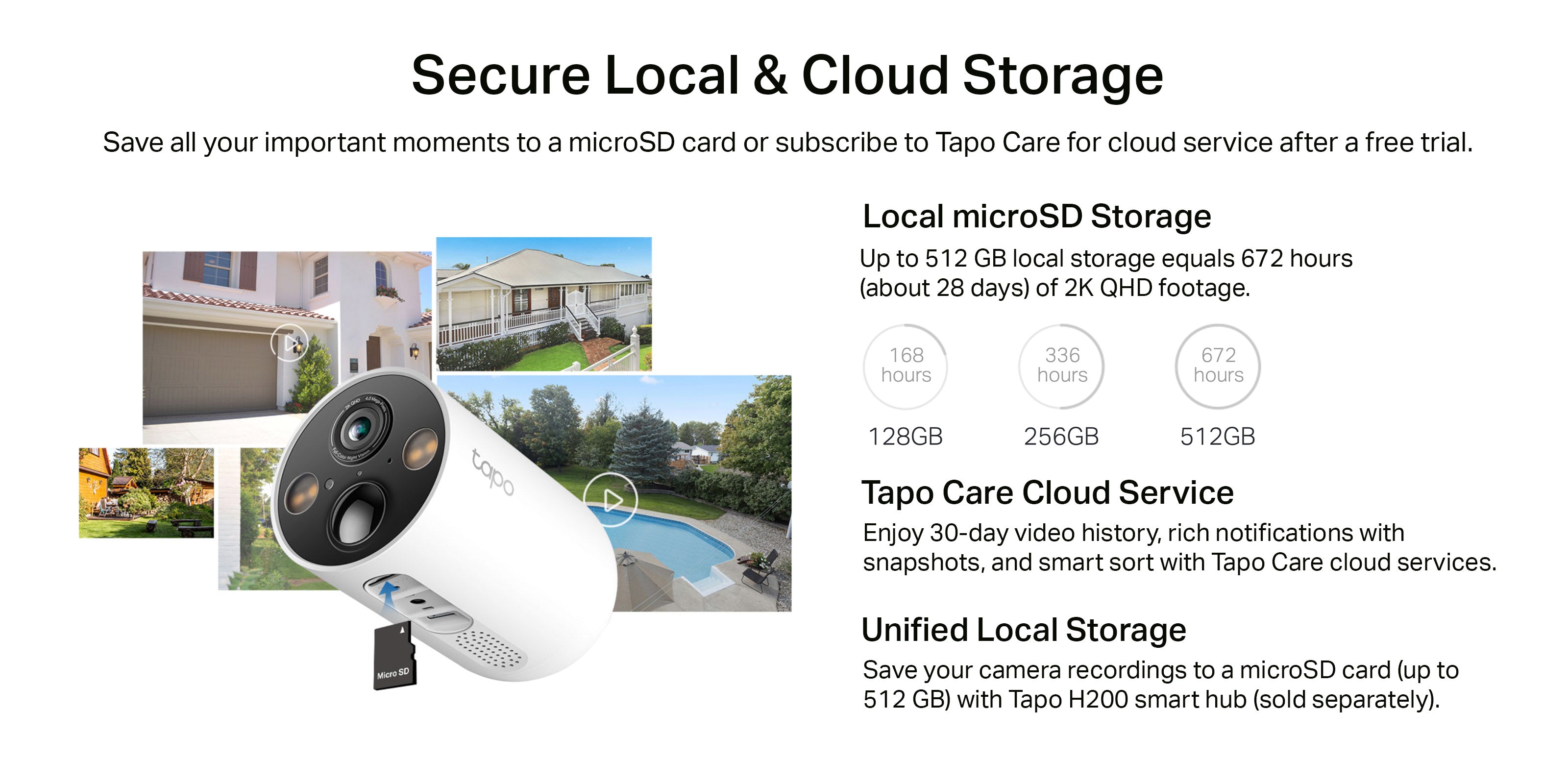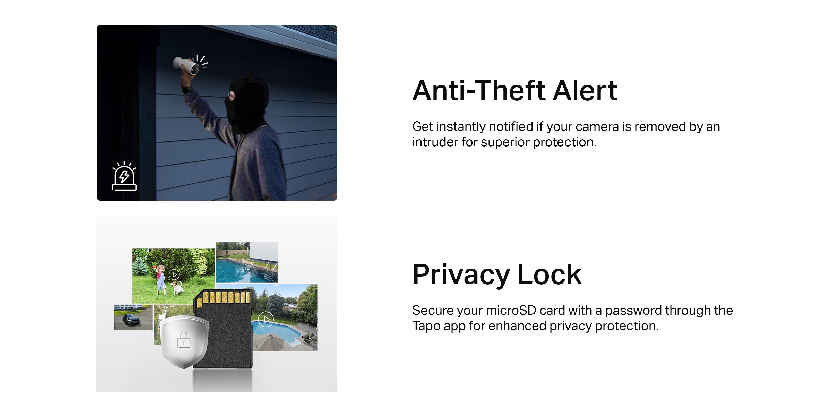 - Anti-Theft Alert & Privacy Lock: Receive instant alerts if the camera is tampered with or removed. Protect your footage by securing the microSD card with password protection via the Tapo app.