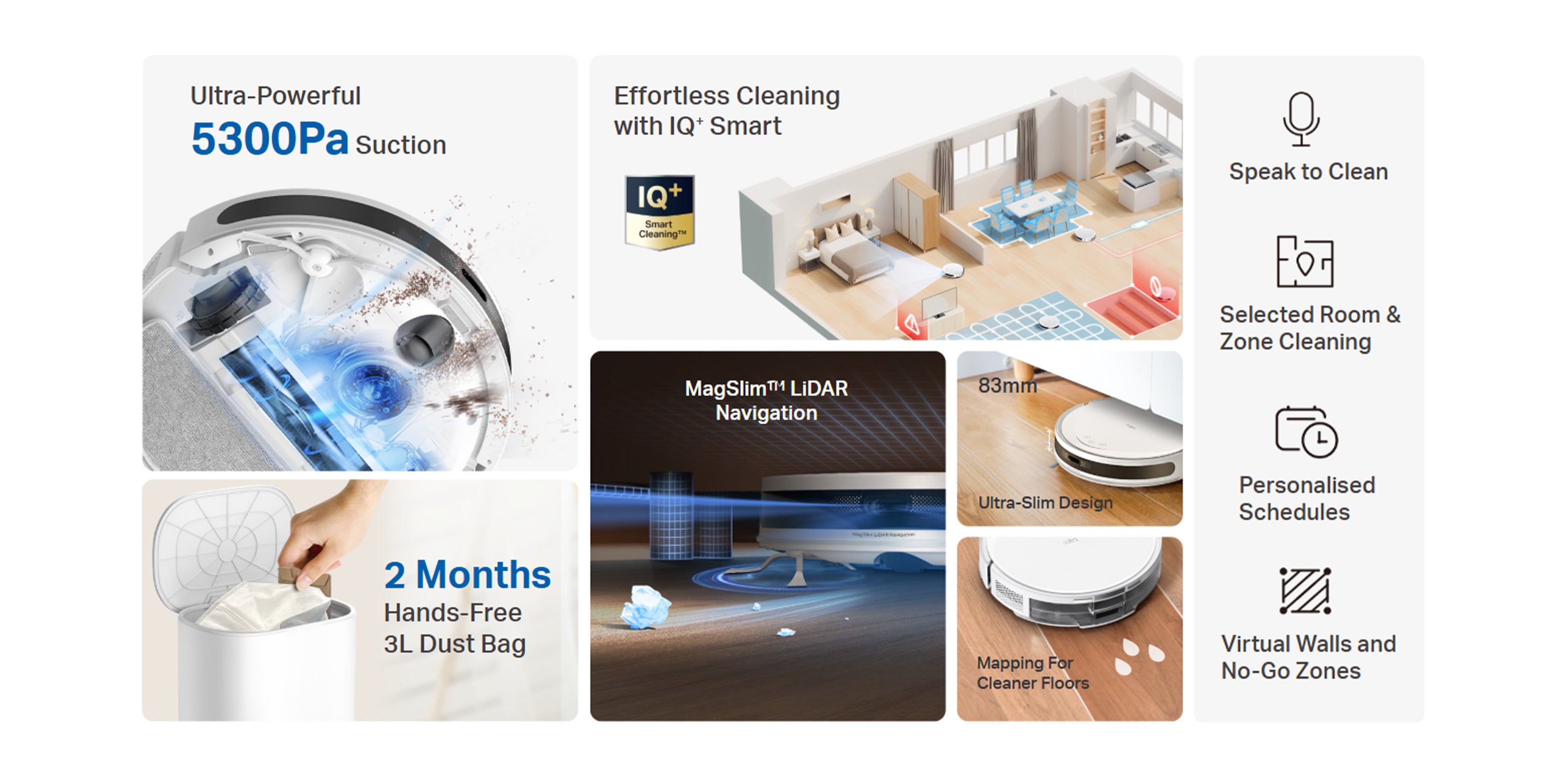 Robotic vacuum and mop with 5300Pa suction, MagSlim LiDAR navigation, auto-empty dock, smart cleaning, carpet avoidance, and voice control for spotless home cleaning.
