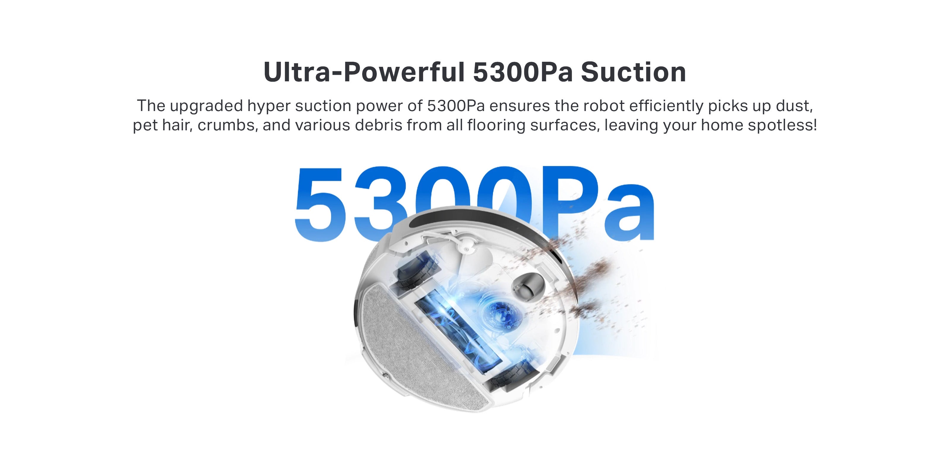 - Ultra-Powerful 5300Pa Suction - Ensures the robot efficiently picks up dust, pet hair, crumbs, and various debris from all flooring surfaces, leaving your home spotless.