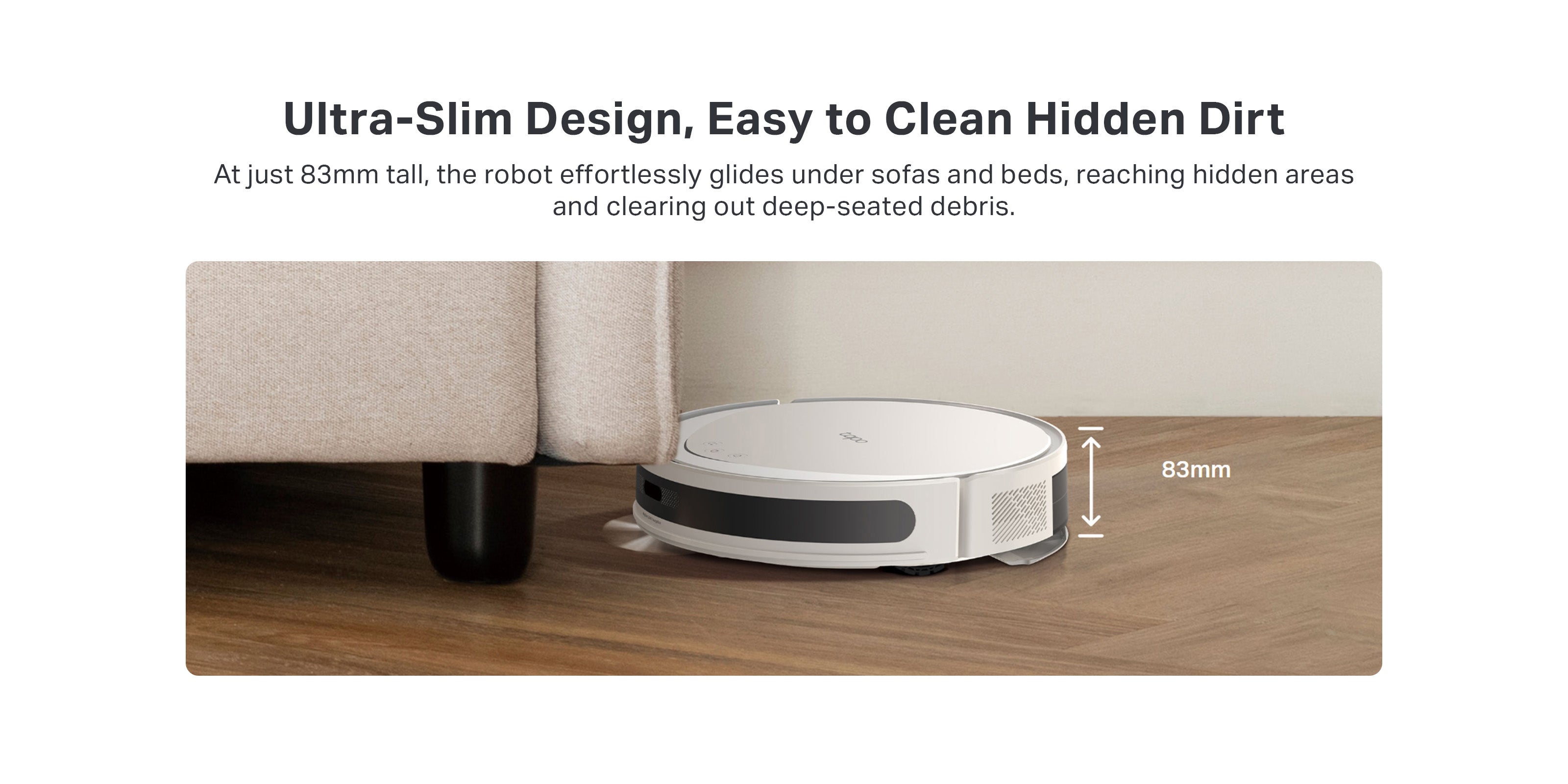 - 83mm Ultra-Slim Design - Effortlessly glides under sofas and beds, reaching hidden areas and clearing out deep-seated debris.