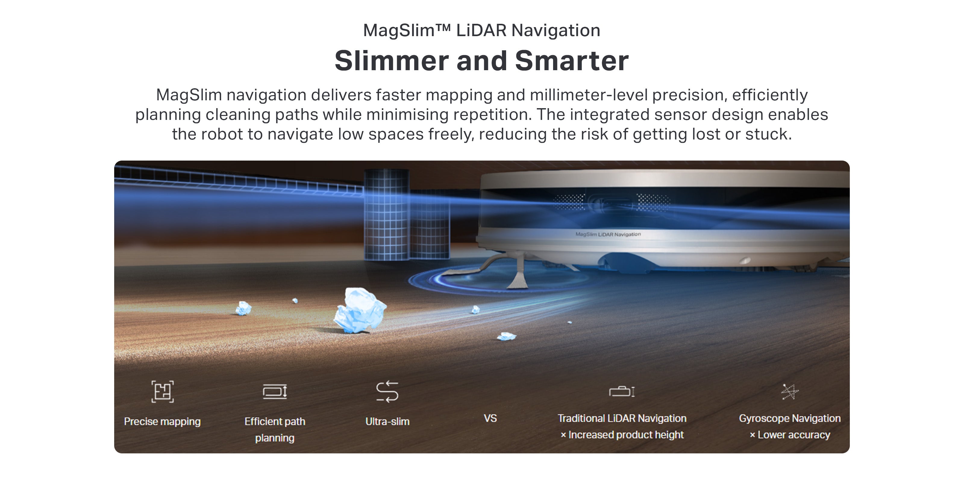 - MagSlim™ LiDAR Navigation - MagSlim navigation delivers faster mapping and millimeter-level precision, efficiently planning cleaning paths while minimising repetition.