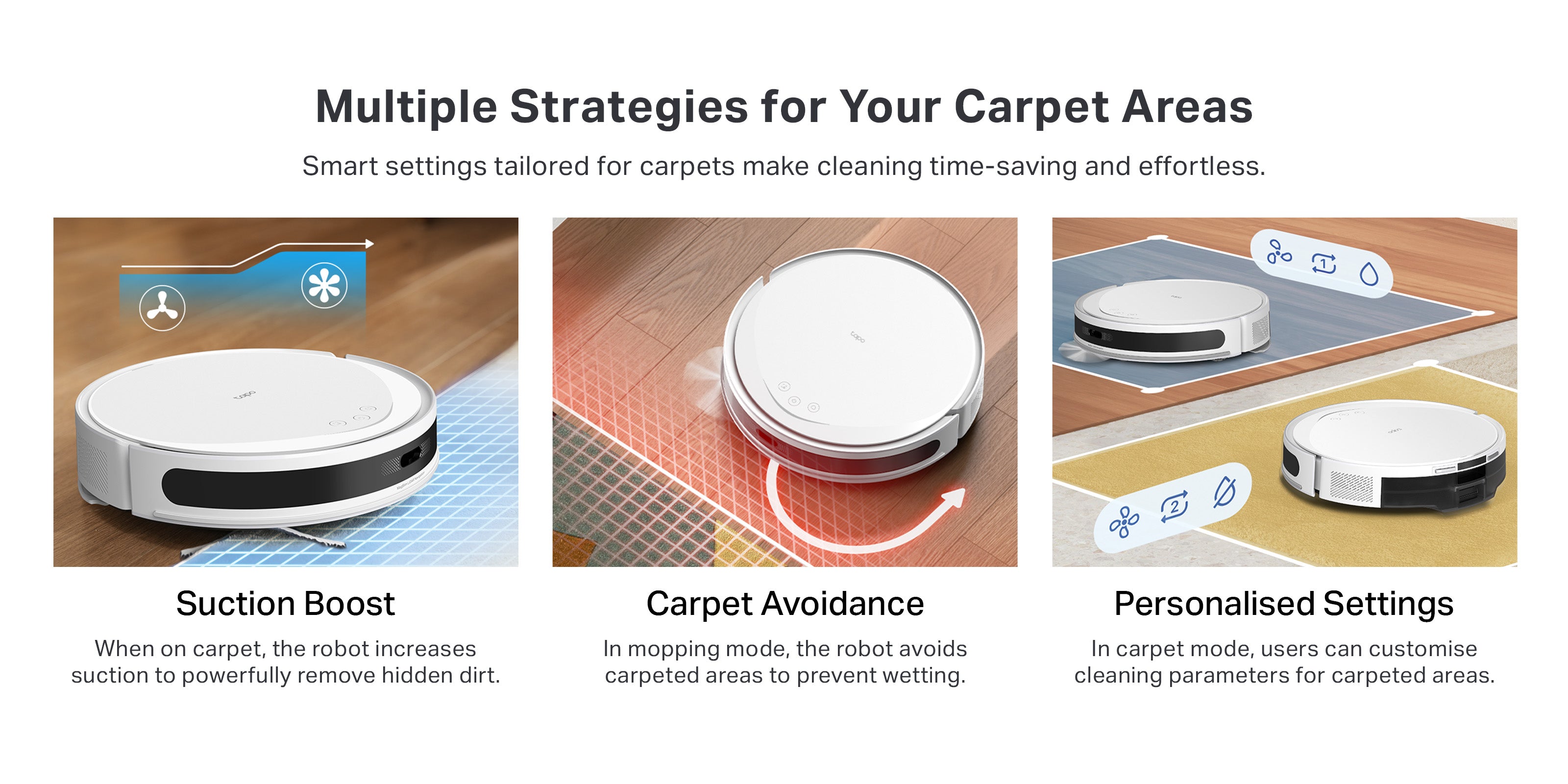 - Carpet Avoidance - Avoid getting carpet areas wet in mopping mode.