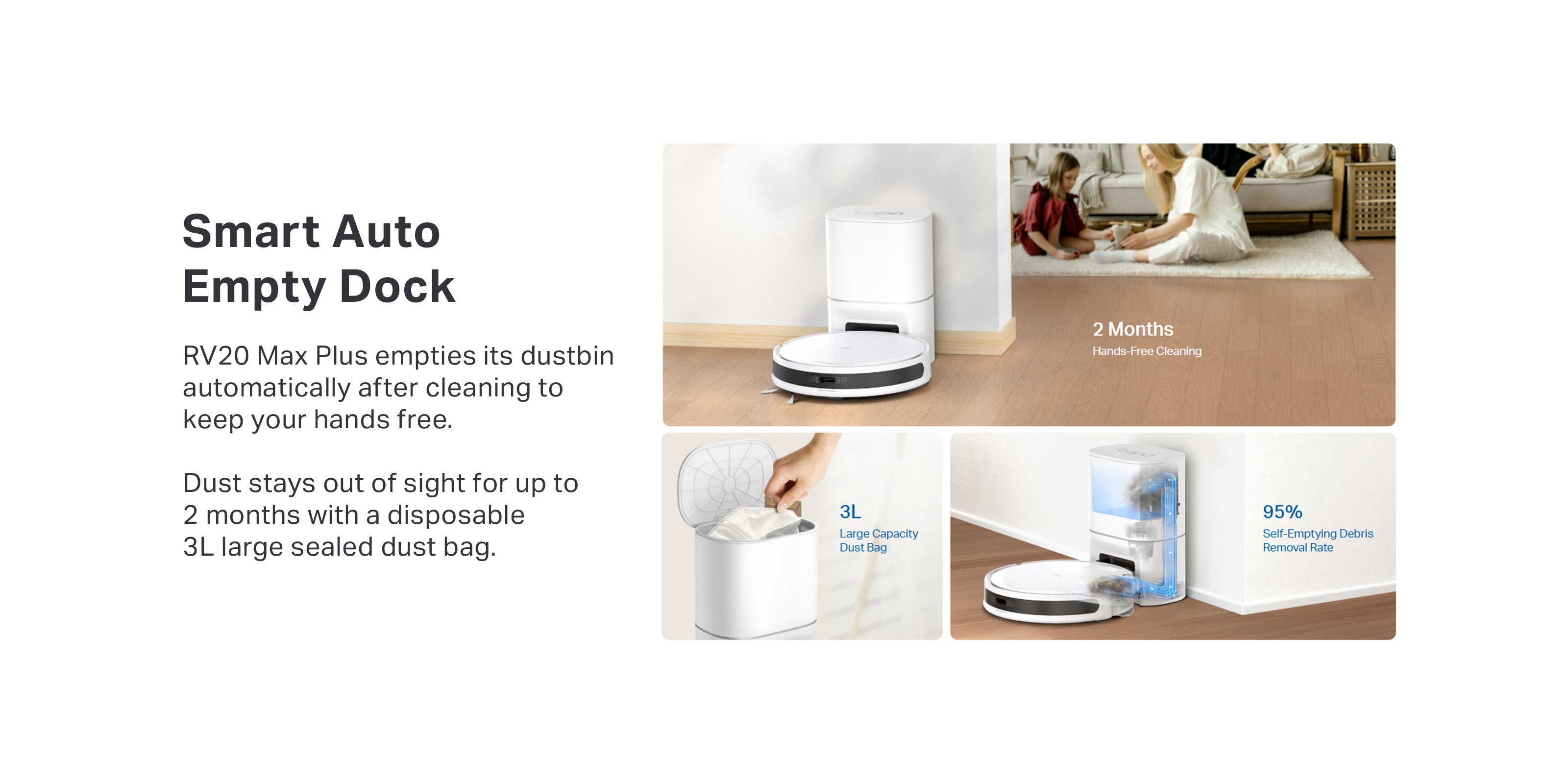 - Auto-Empty with 3L Large Dust Bag - Dust stays out of sight for up to 2 months with a disposable 3L large sealed dust bag.