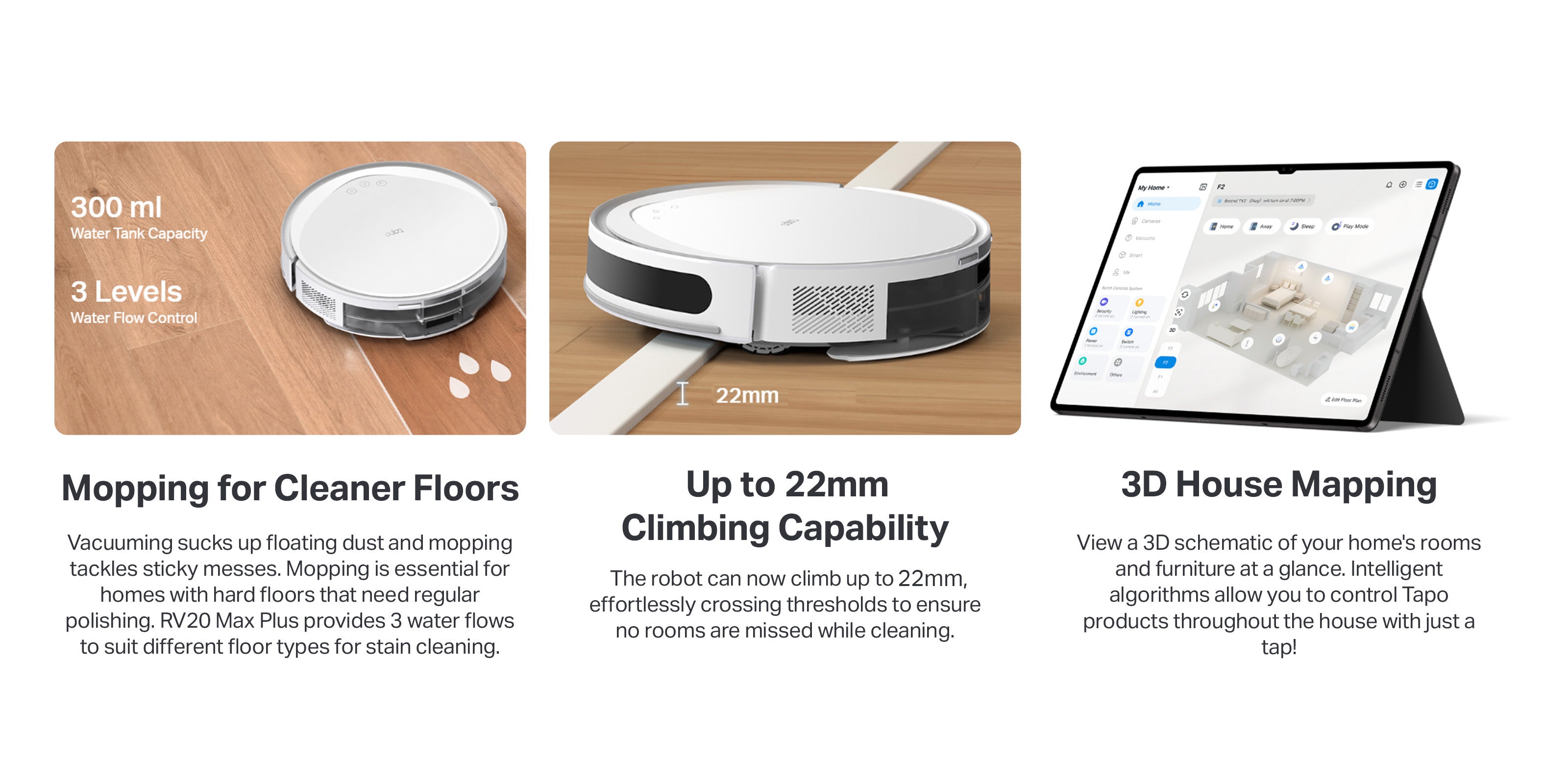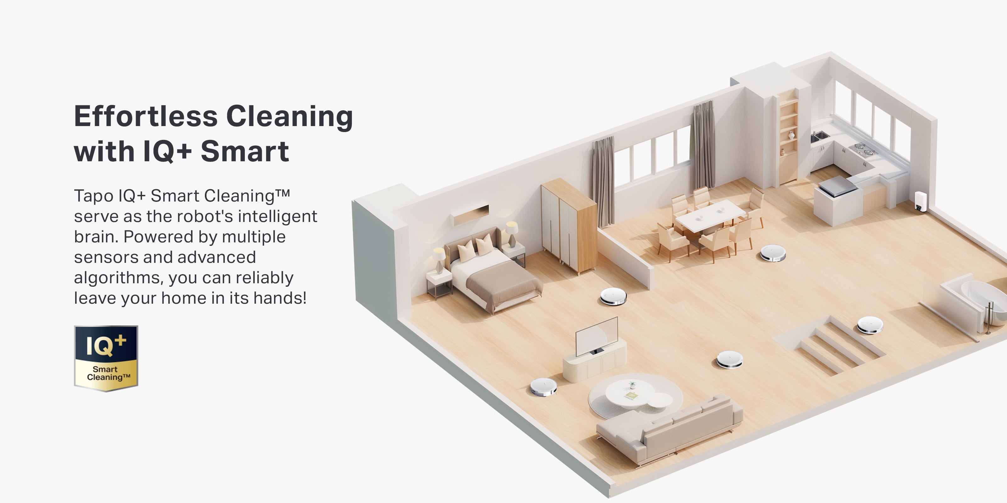 - Tapo IQ+ Smart Cleaning™ - Serves as the robot's brain. Powered by multiple sensors and advanced algorithms, you can reliably leave your home in its hands.