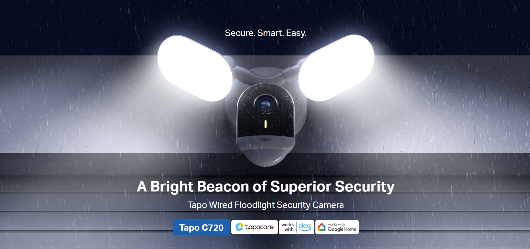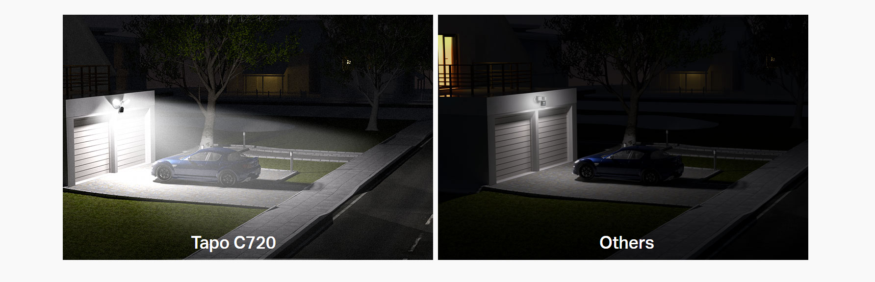 - 2800-Lumen Ultra-Bright Floodlight: Tapo C720's powerful, fully adjustable floodlight and colour night vision sees up to 30 feet away, so you can sleep soundly knowing your surroundings are safe.