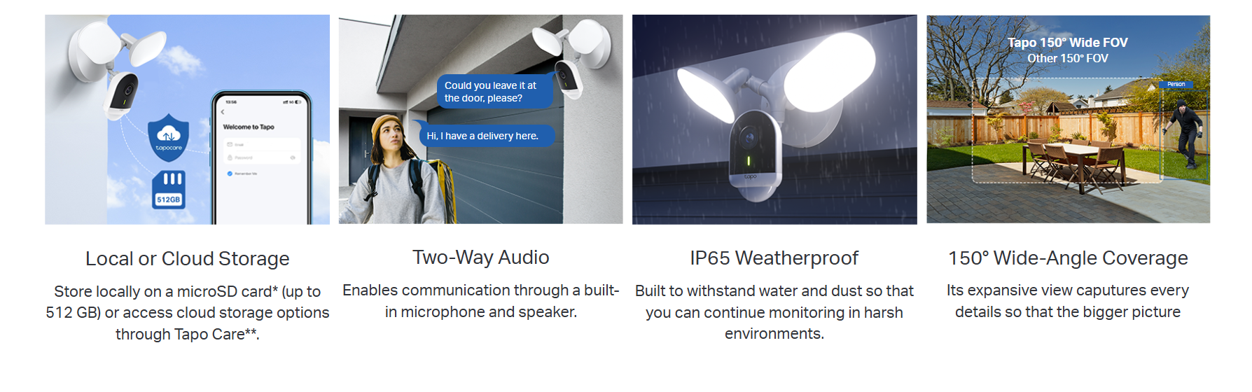 - Local or Cloud Storage: Save and store footage locally on a microSD card* (up to 512 GB) or access recordings anytime, anywhere with Tapo Care cloud storage.**