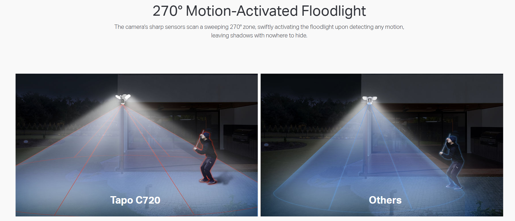 - Motion-Activated Floodlight: With hawk-like precision in darkness, C720 detects transient motions, activating a floodlight over a sweeping 270° area.