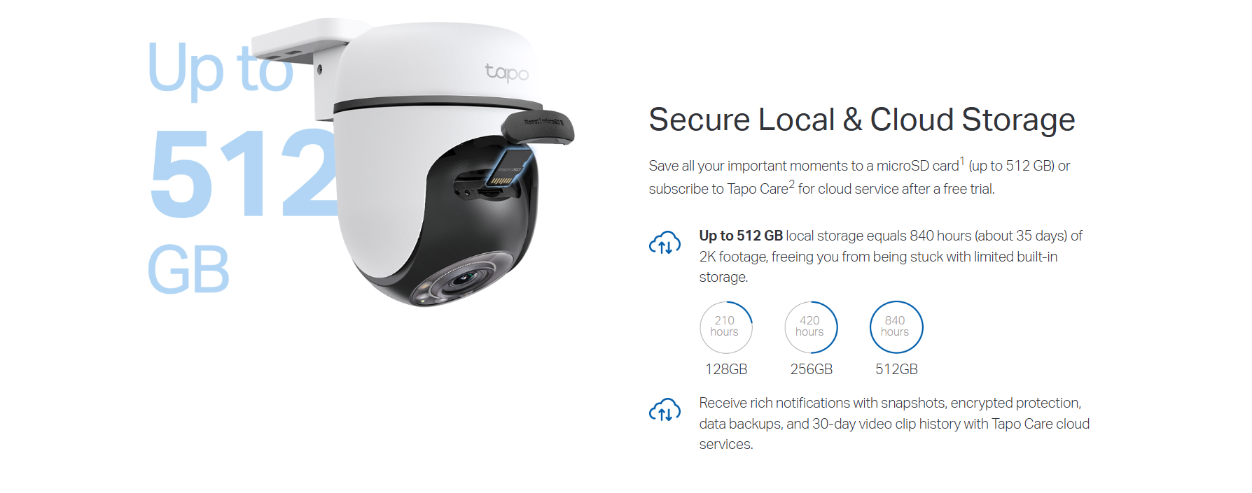 - Local and Cloud Storage-Save recorded videos to a microSD card (up to 512 GB) or by using Tapo Care cloud services.