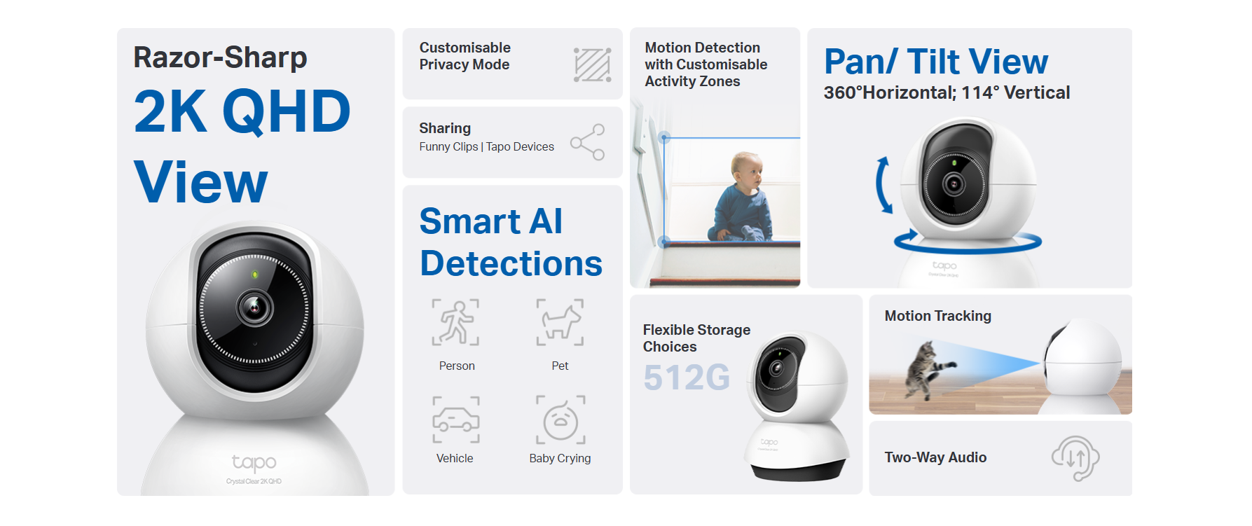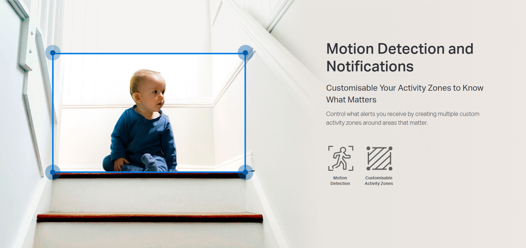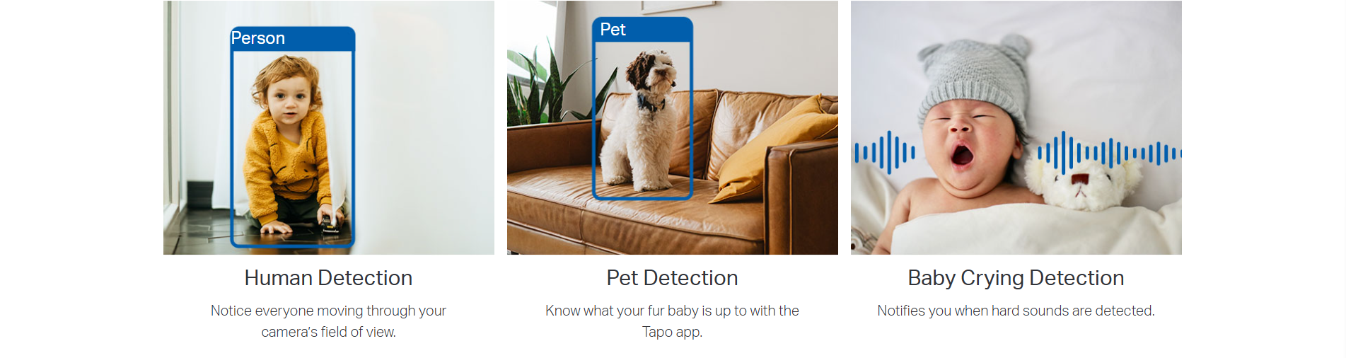 Smart AI identifies people, pets, and vehicles while recognising a baby crying and other sounds, notifying users as needed.