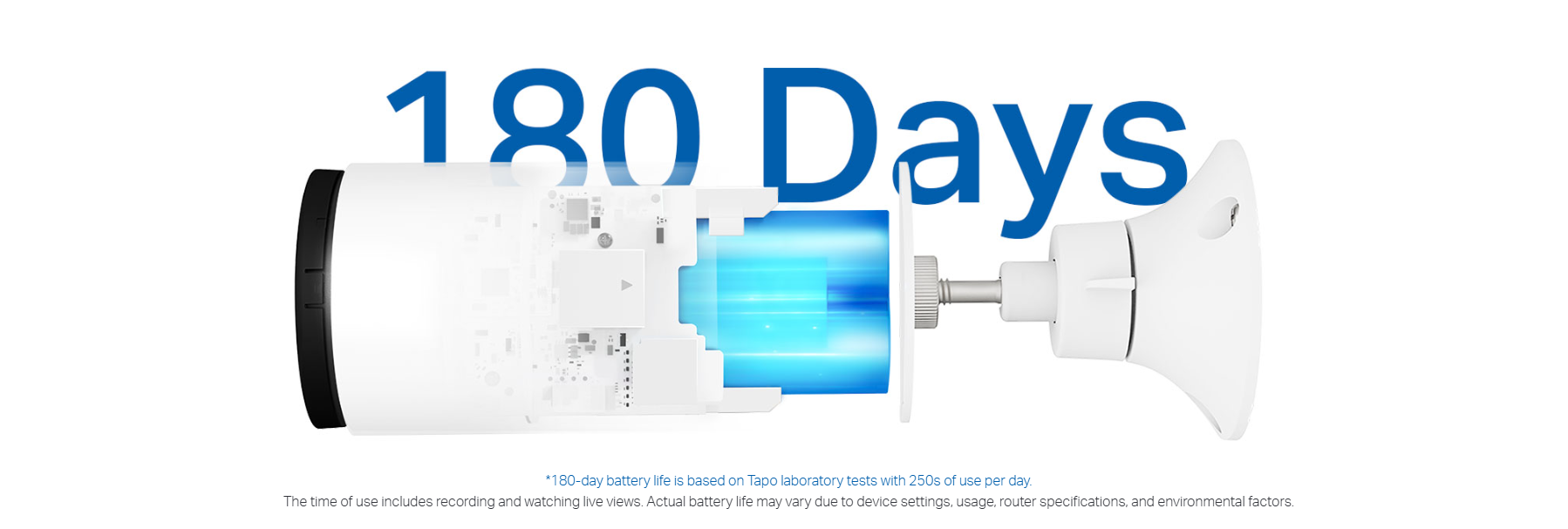1. 180-day battery life is based on Tapo laboratory tests with 250s of use per day. The time of use includes recording and watching live views. Actual battery life may vary due to device settings, usage, router specifications, and environmental factors.