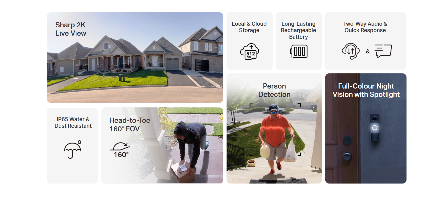 Subscription-free battery video doorbell with included chime, 6-month battery life, 2K clarity, ultra-wide view, and full-colour night vision for enhanced security monitoring.