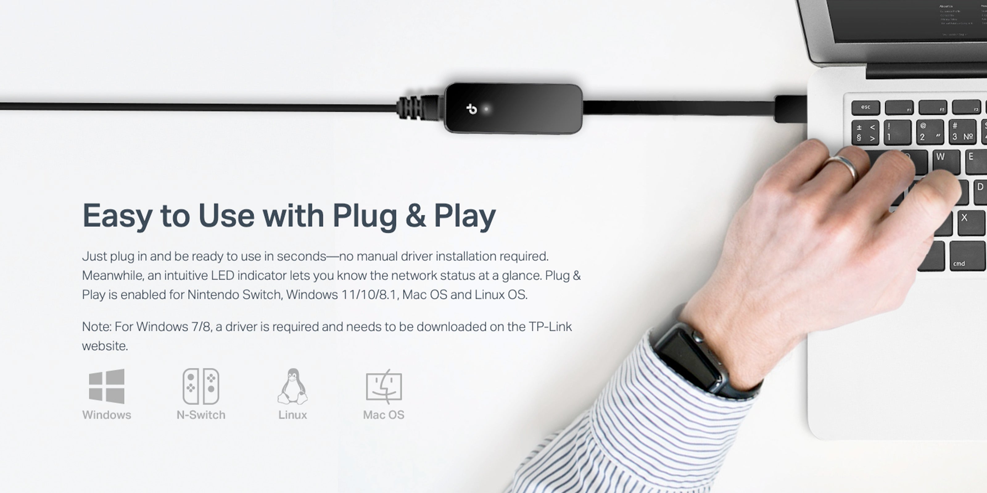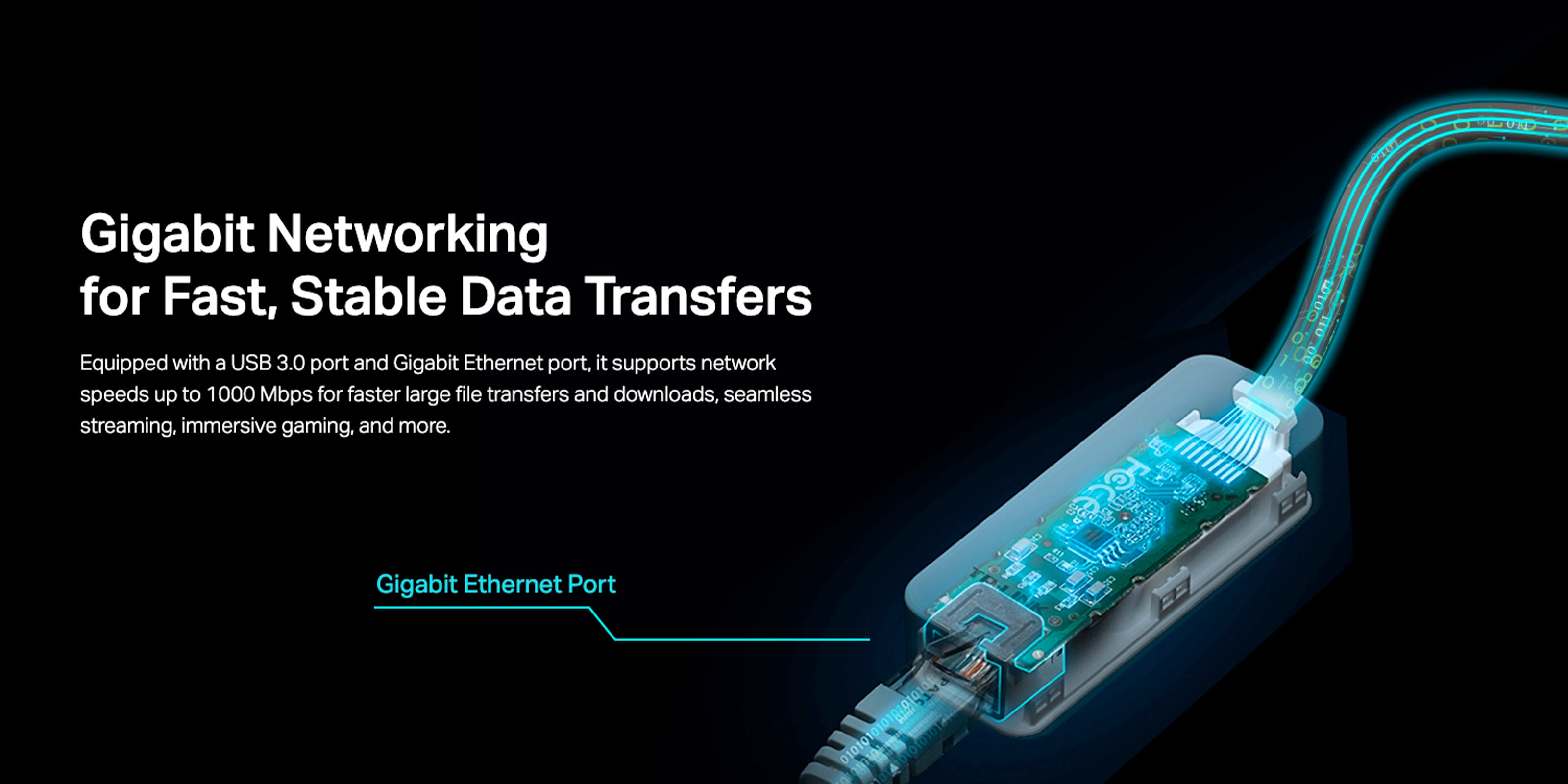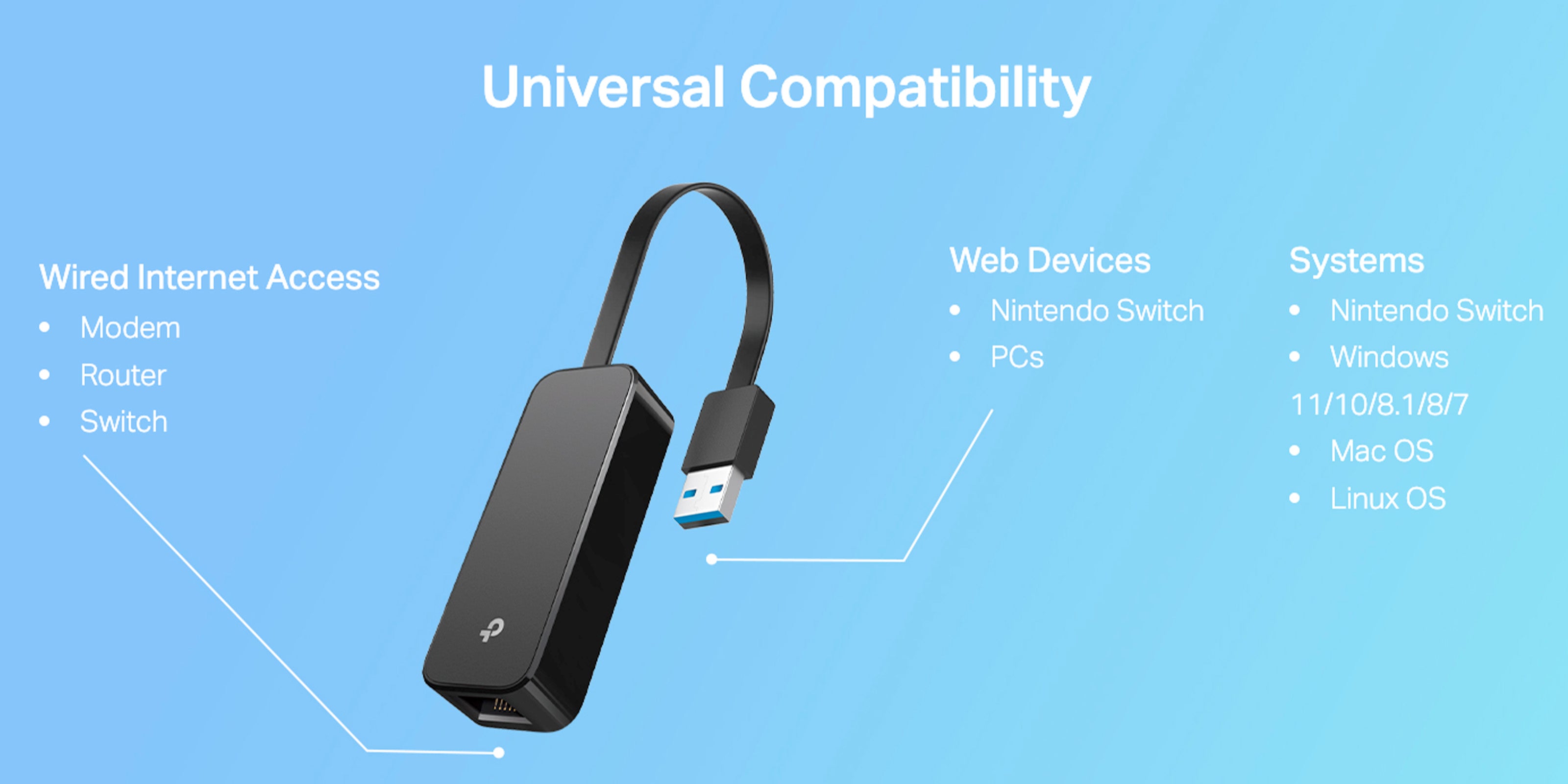 Fast portable USB 3.0 Gigabit Ethernet adapter enabling high-speed transfers and Plug and Play connectivity for Nintendo Switch gaming, Windows, Mac, Linux, and Ultrabooks.