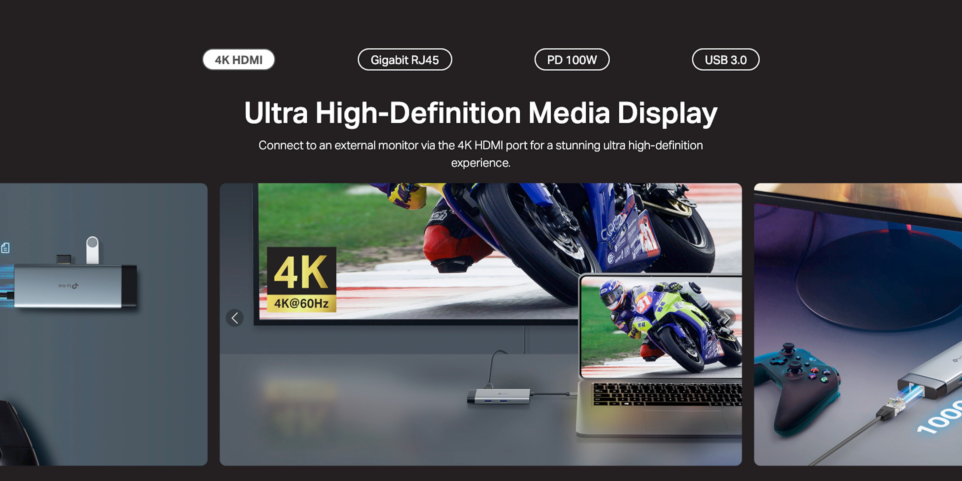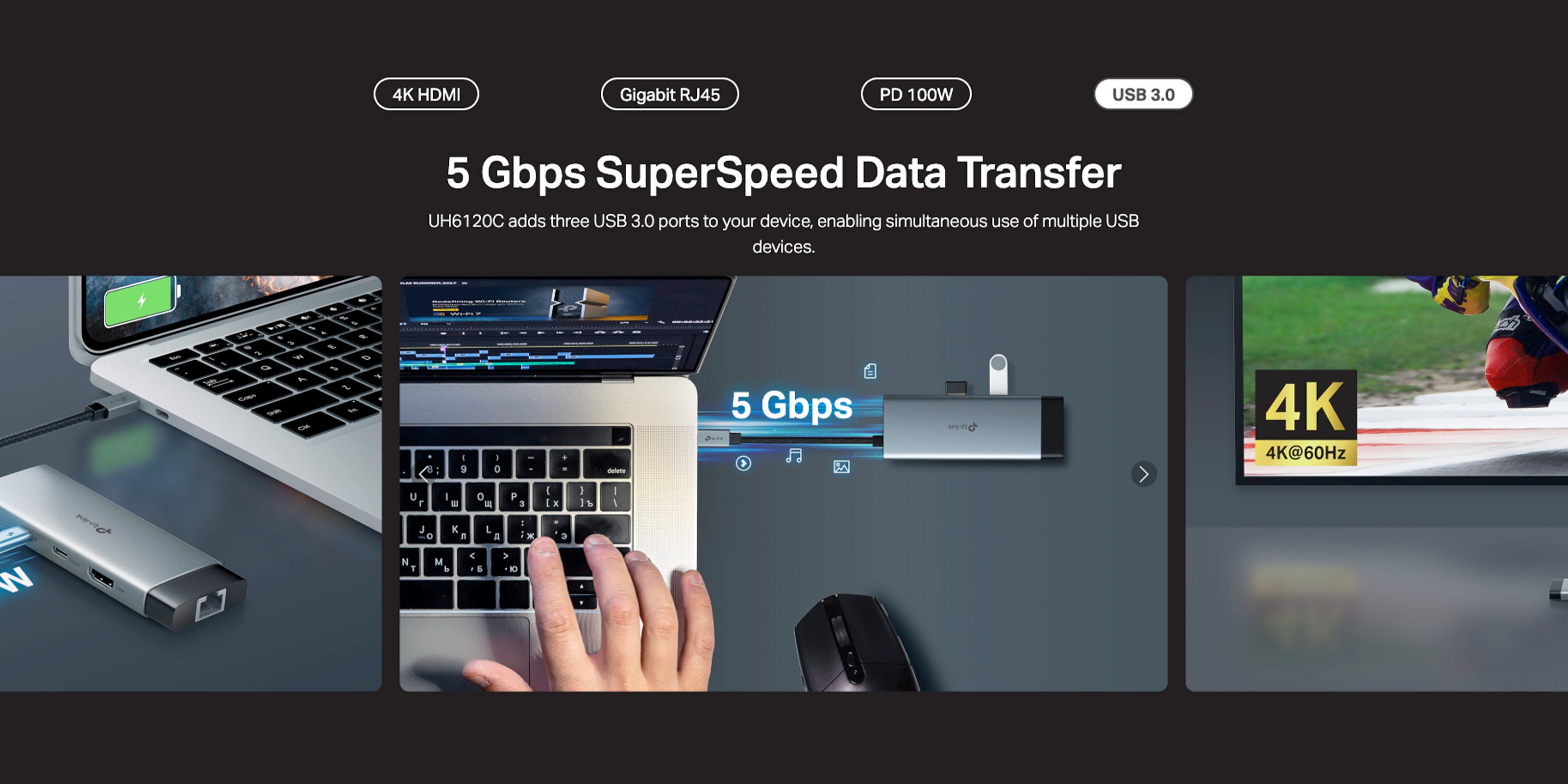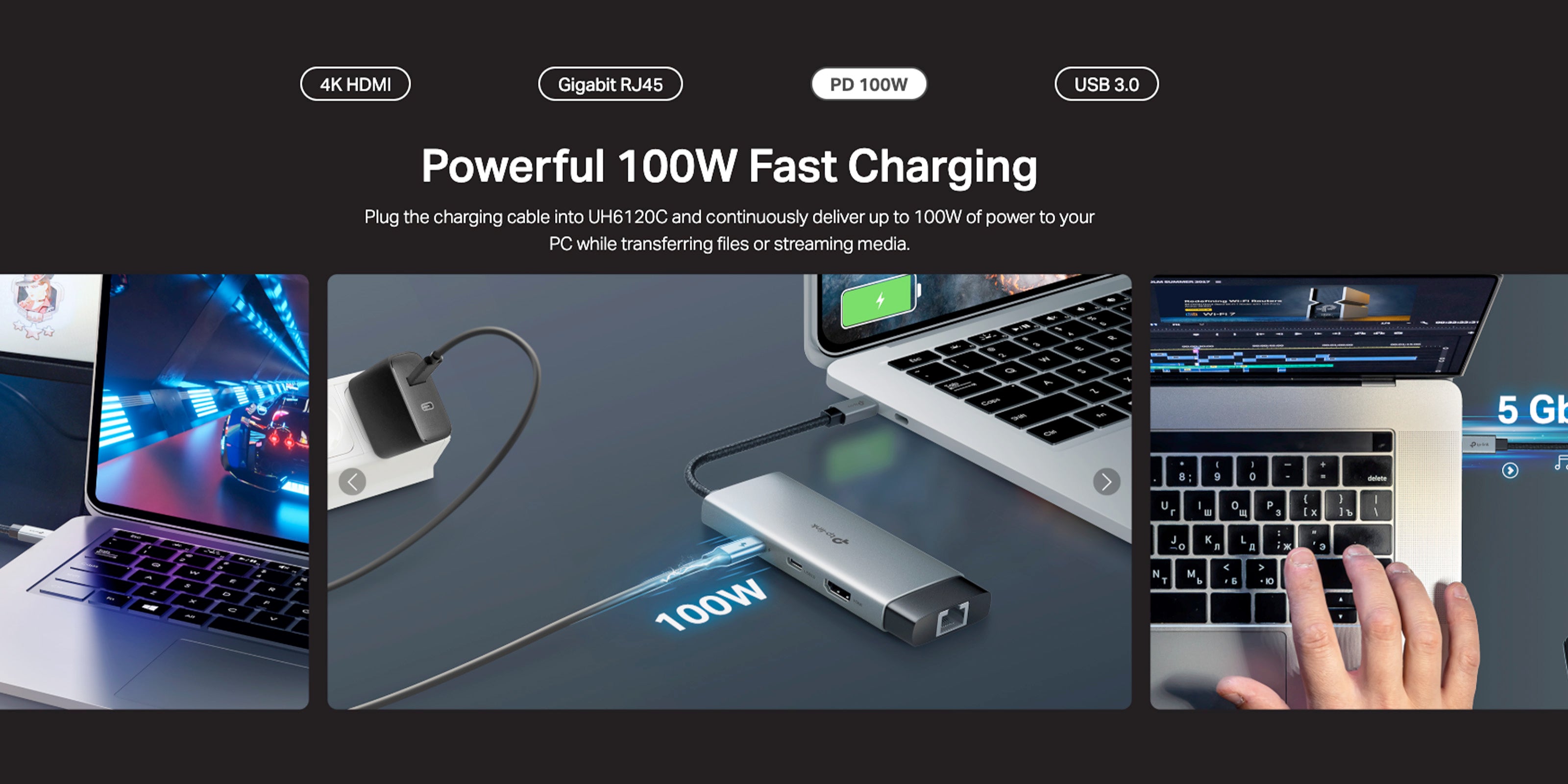 - Powerful 100W Fast Charging: Plug the charging cable into UH6120C and continuously deliver up to 100W of power to your PC while transferring files or streaming media.