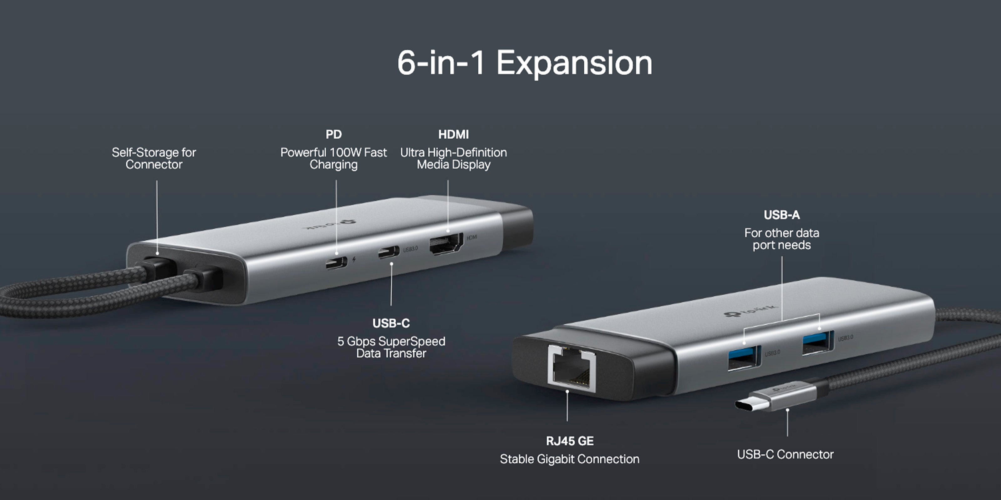 - 6 in 1 USB-C Hub: UH6120C turns a single USB-C port into 6 ports with a 4K@60Hz HDMI, 1 Gbps ethernet, 100W Power Delivery, 1× USB-C Data Ports, 2× USB-A Data Ports.