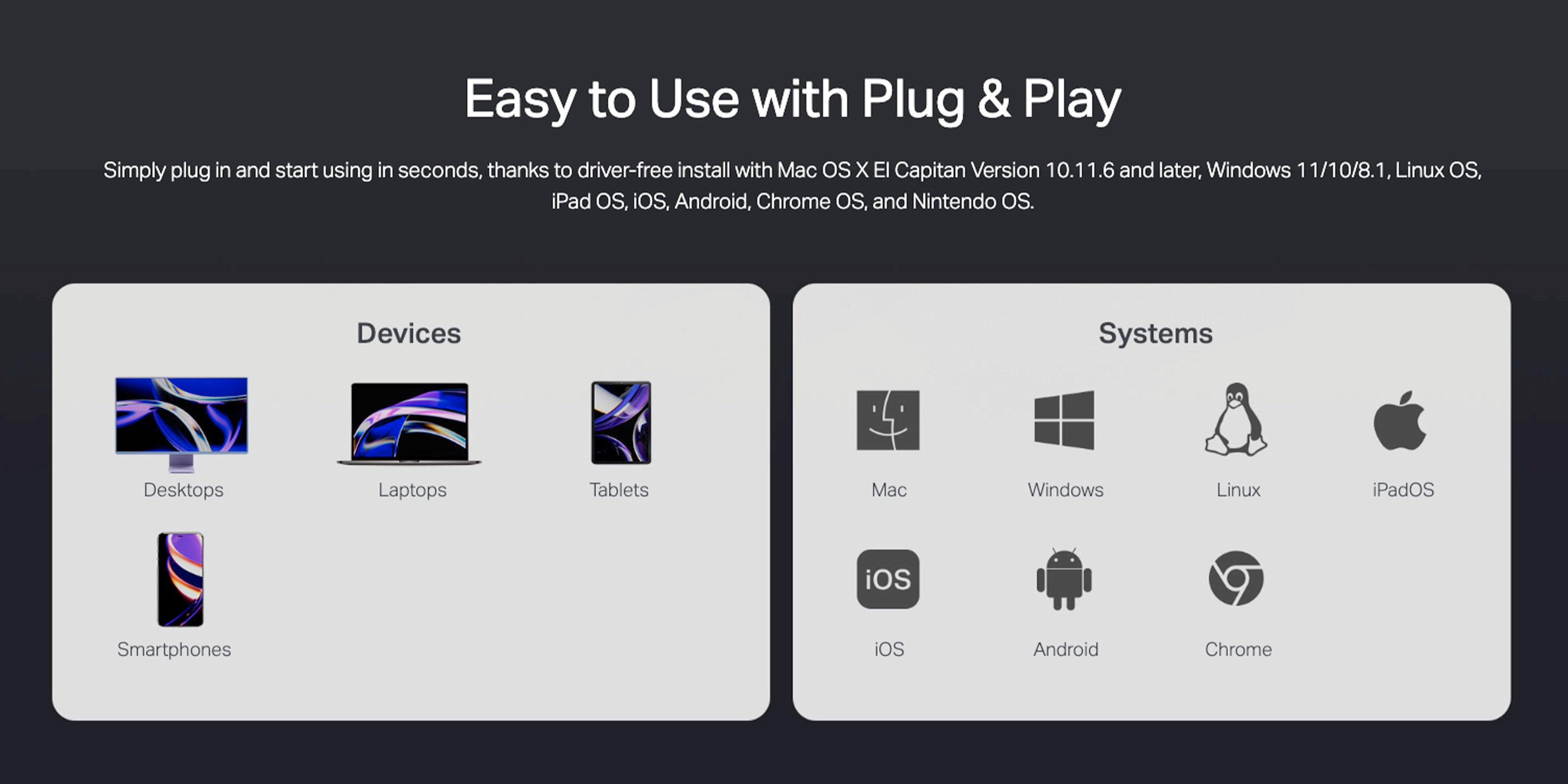 - Easy to Use with Plug & Play: Simply plug in and start using in seconds, thanks to driver-free install with Mac OS X El Capitan Version 10.11.6 and later, Windows 11/10/8.1, Linux OS, iPad OS, iOS, Android, Chrome OS, and Nintendo OS.