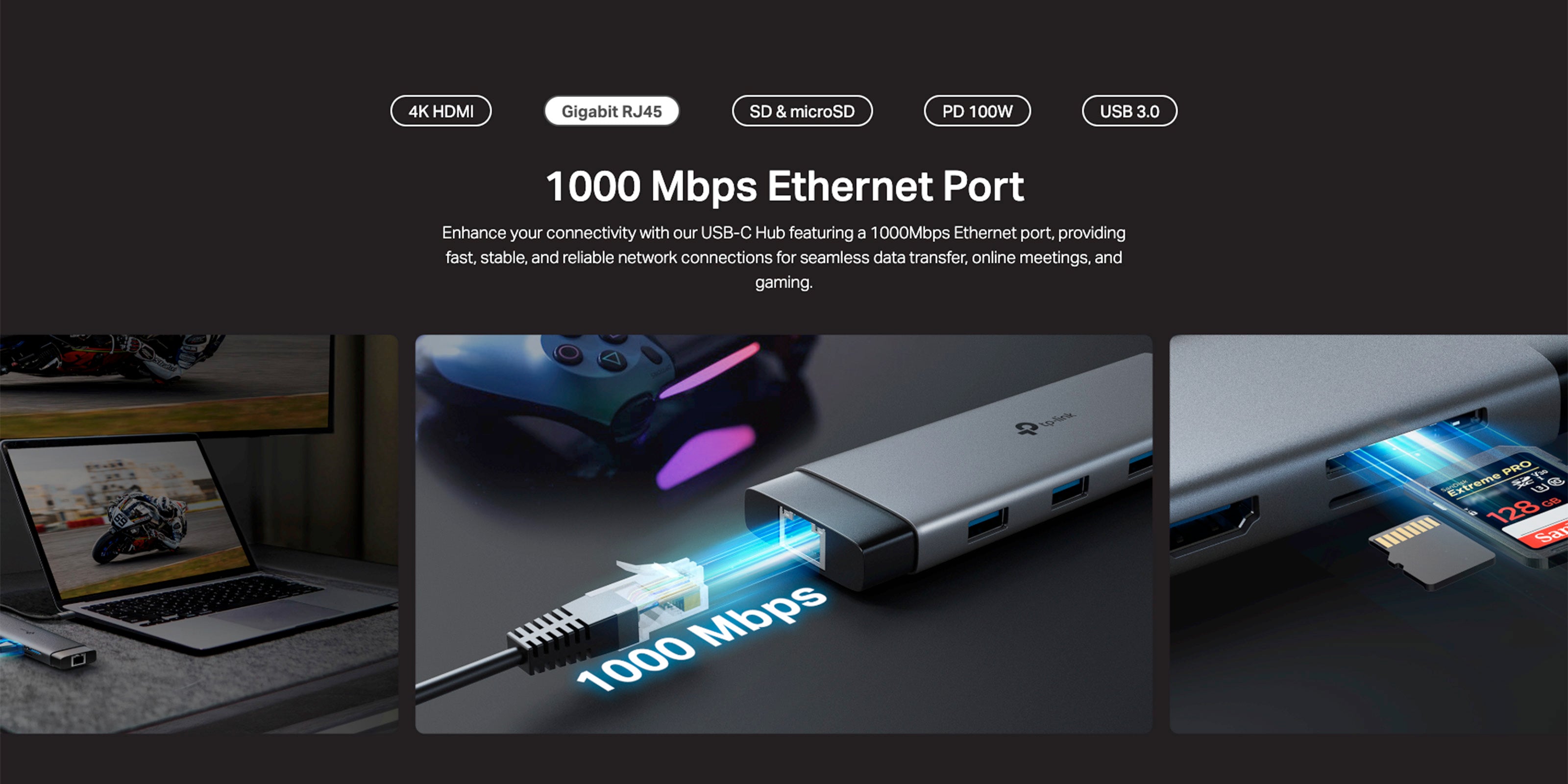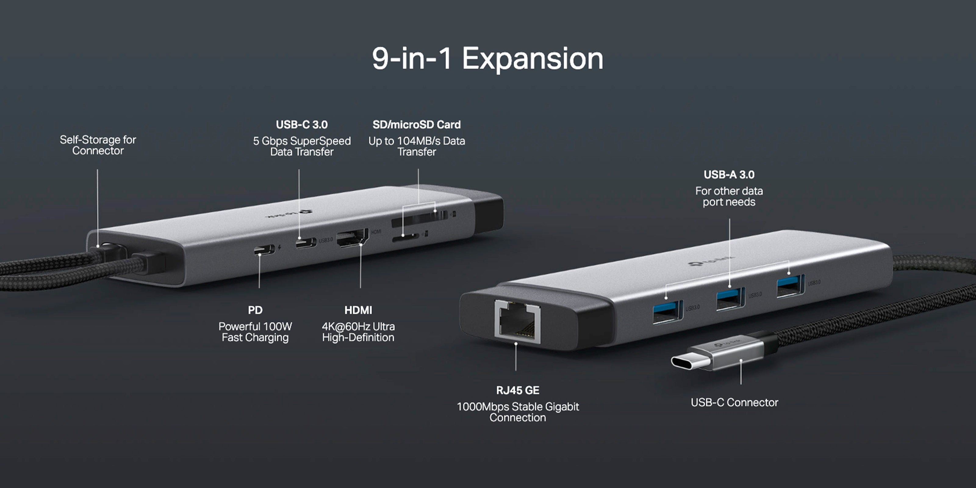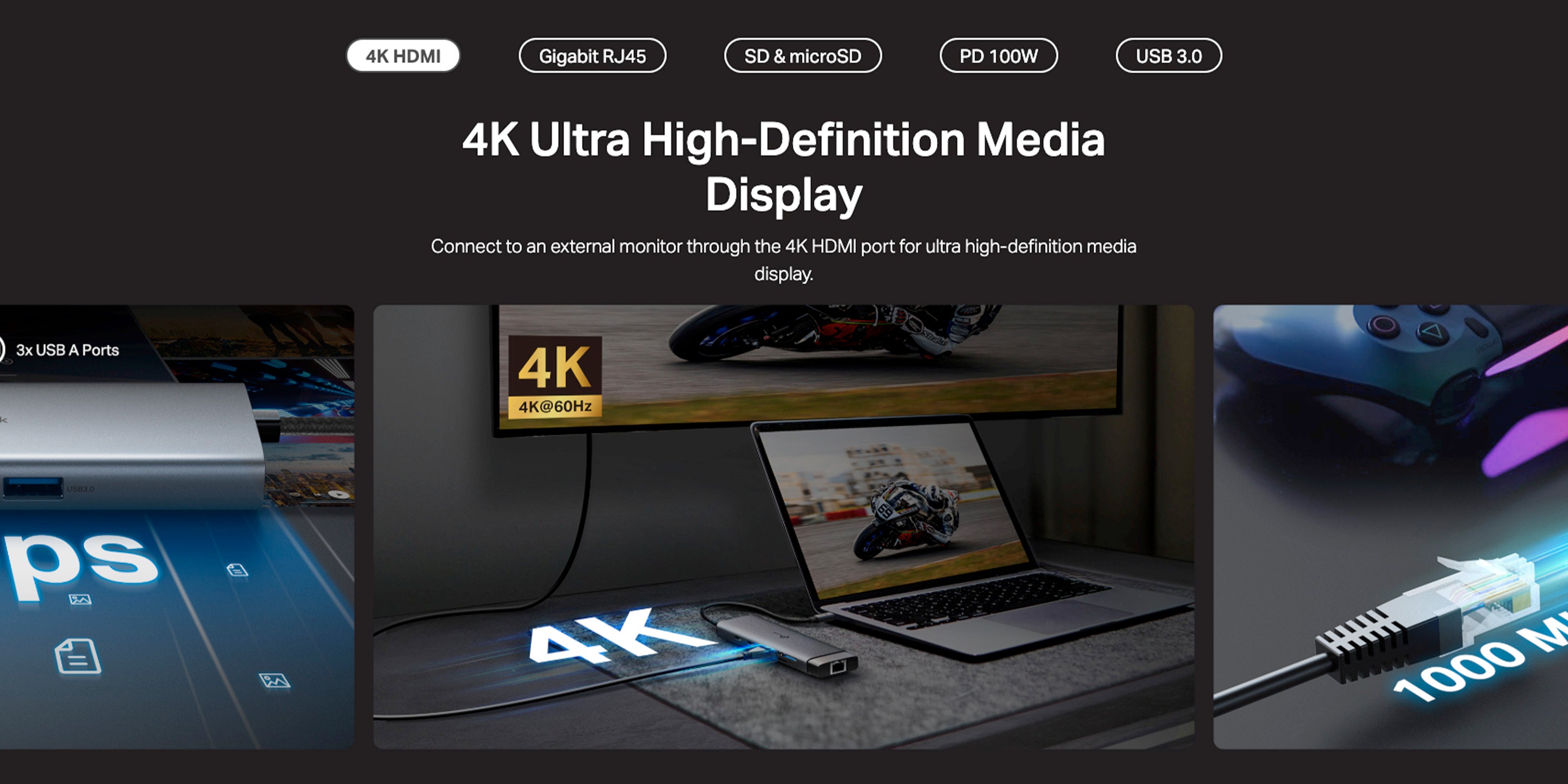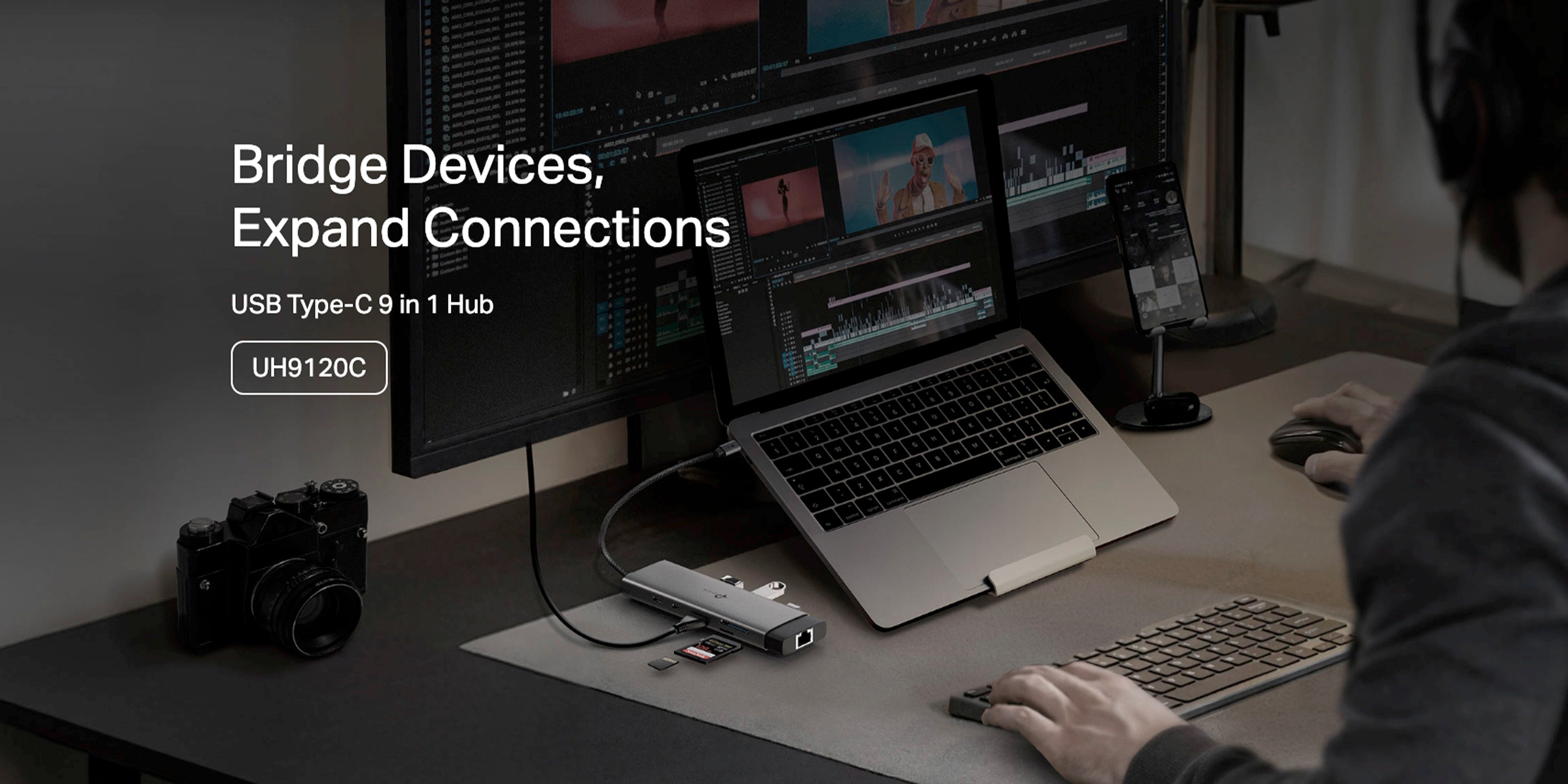 - 9 in 1 USB-C Hub: UH9120C turns a single USB-C port into 9 ports with a 4K@60Hz HDMI, 1 Gbps ethernet, SD & microSD UHS-I, 100W Power Delivery, 1× USB-C Data Ports, 3× USB-A Data Ports.