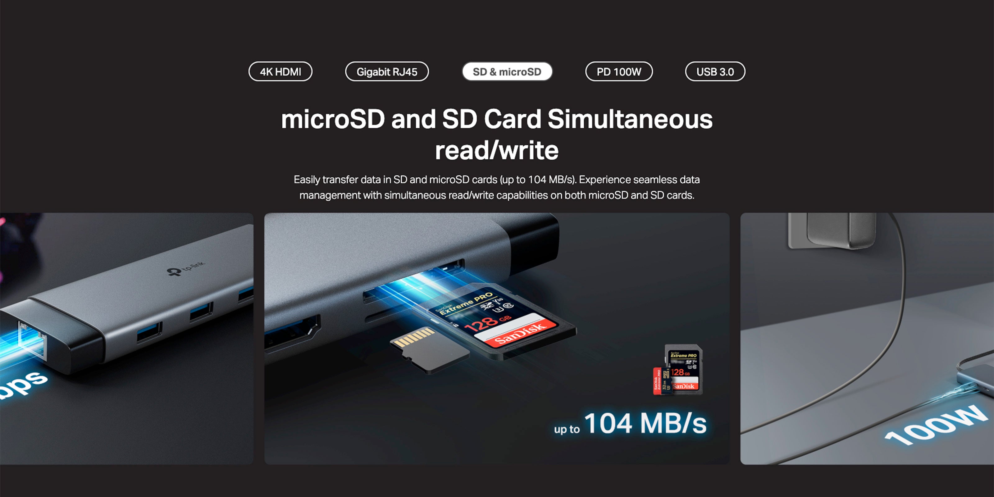- SD & microSD UHS-I: Easily transfer data in SD and microSD cards (up to 104 MB/s). Experience seamless data management with simultaneous read/write capabilities on both microSD and SD cards.